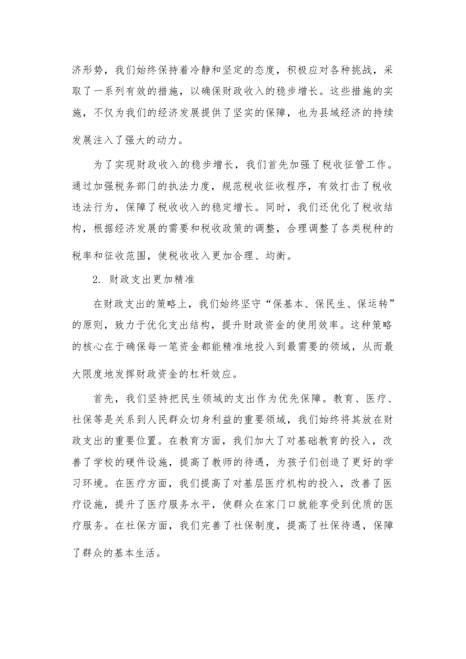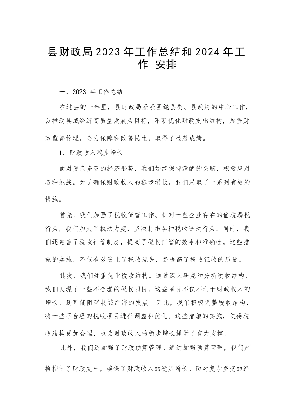 縣財政局2023年工作總結(jié)和2024年工作安排一、2023年工作總結(jié)在過去的一年里,縣財政局緊緊圍繞縣委、縣政府的中心工作,以推動縣域經(jīng)濟高質(zhì)量發(fā)展為目標,不斷優(yōu)化財政支出結(jié)構(gòu),加強財政監(jiān)督管理,全力保障和改善民生,取得了顯著成績。1.財政收入穩(wěn)步增長面對復雜多變的經(jīng)濟形勢,我們始終保持清醒的頭腦,積極應(yīng)對各種挑戰(zhàn)。為了確保財政收入的穩(wěn)步增長,我們采取了一系列有效的措施。首先,我們加強了稅收征管工作。針對一些企業(yè)存在的偷稅漏稅行為,我們加大了執(zhí)法力度,堅決打擊各種稅收違法行為。同時,我們還完善了稅收征管制度,提高了稅收征管的效率和準確性。...