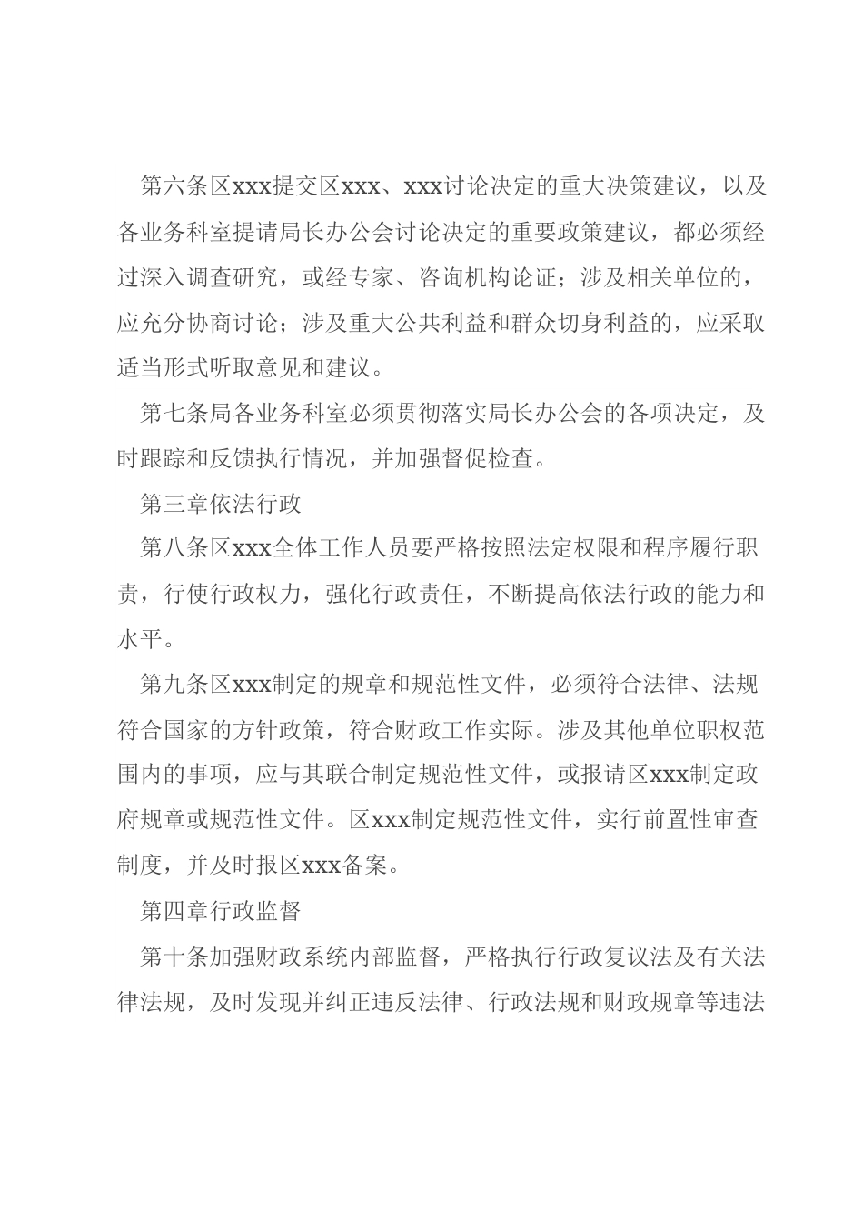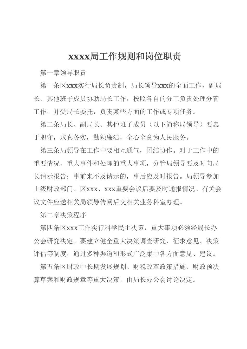 xxxx局工作規(guī)則和崗位職責第一章領(lǐng)導職責第一條區(qū)xxx實行局長負責制,局長領(lǐng)導xxx的全面工作,副局長、其他班子成員協(xié)助局長工作,按照各自的分工負責處理分管工作,并受局長委托,負責某些方面的工作或?qū)m椚蝿?。第二條局長、副局長、其他班子成員(以下簡稱局領(lǐng)導)要忠于職守,求真務實,勤勉廉潔,全心全意為人民服務。第三條局領(lǐng)導在工作中要相互通氣,團結(jié)協(xié)作。對于工作中的重要情況、重大事件和處理的重大事項,分管局領(lǐng)導要及時向局長請示報告;事前來不及請示的,事后應及時報告。局領(lǐng)導參加上級財政部門、區(qū)xxx、xxx重要會議后要及時通報情況。有關(guān)會議文件應...