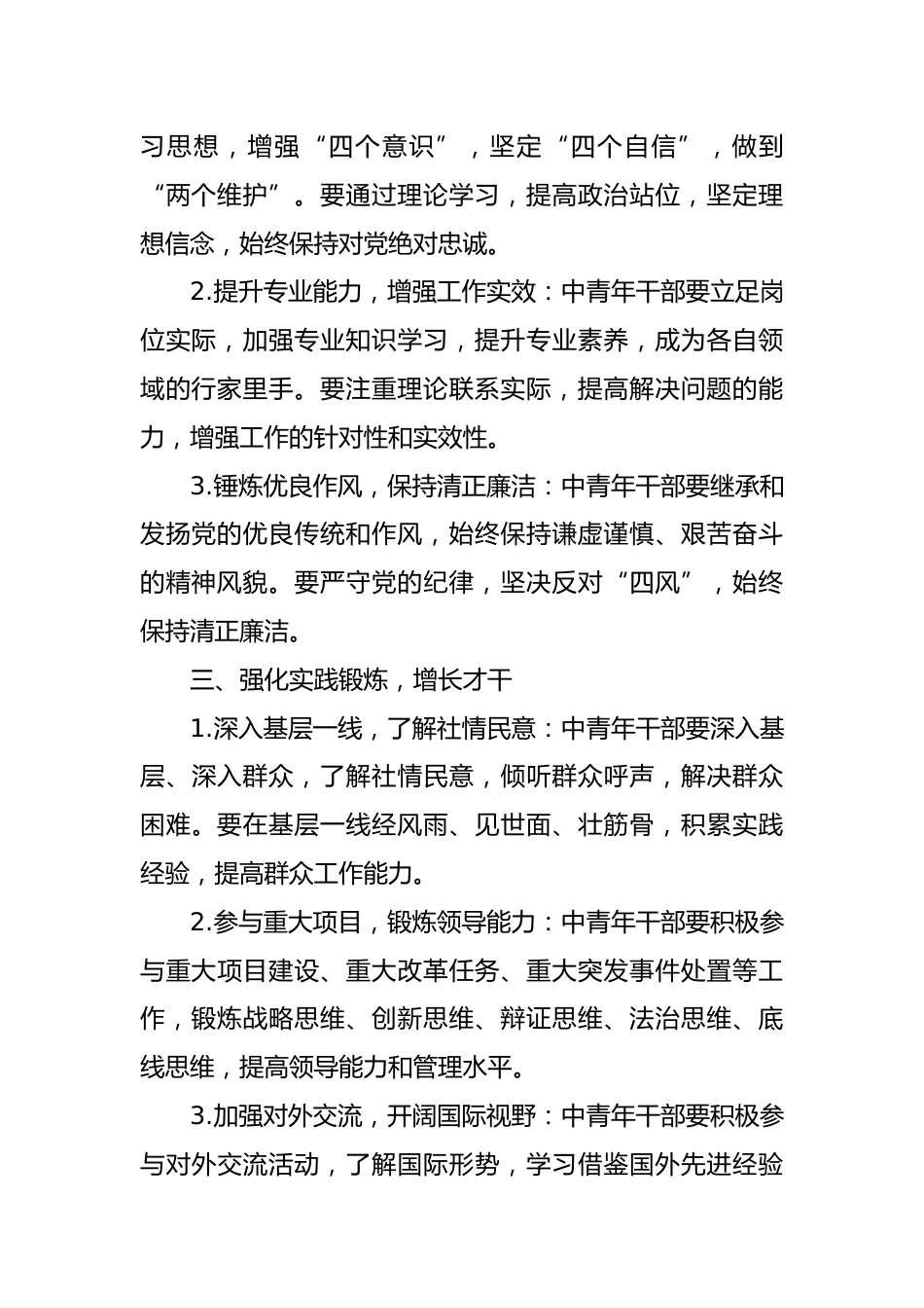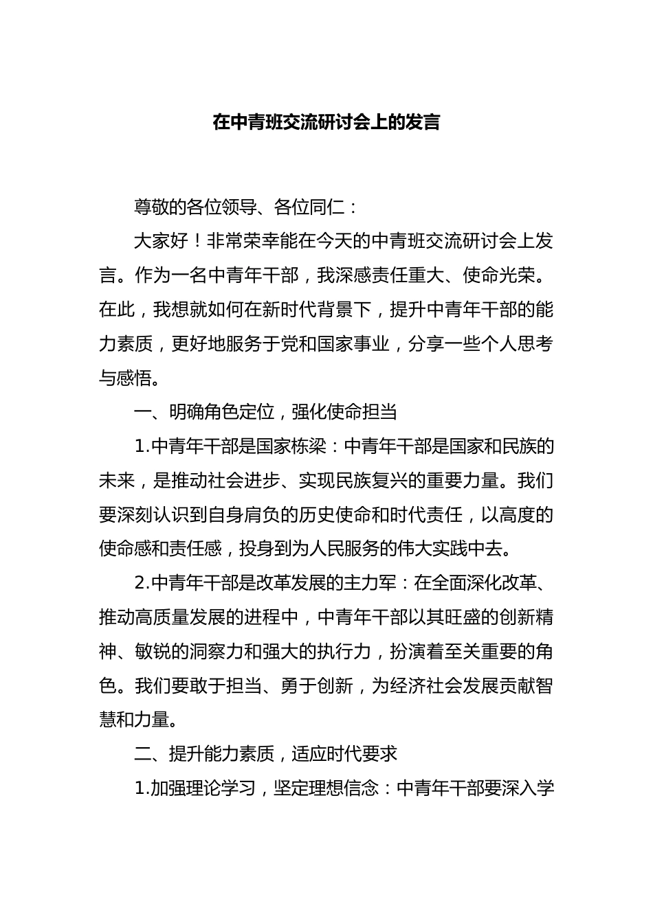 在中青班交流研討會(huì)上的發(fā)言尊敬的各位領(lǐng)導(dǎo)、各位同仁:大家好!非常榮幸能在今天的中青班交流研討會(huì)上發(fā)言。作為一名中青年干部,我深感責(zé)任重大、使命光榮。在此,我想就如何在新時(shí)代背景下,提升中青年干部的能力素質(zhì),更好地服務(wù)于黨和國家事業(yè),分享一些個(gè)人思考與感悟。一、明確角色定位,強(qiáng)化使命擔(dān)當(dāng)1.中青年干部是國家棟梁:中青年干部是國家和民族的未來,是推動(dòng)社會(huì)進(jìn)步、實(shí)現(xiàn)民族復(fù)興的重要力量。我們要深刻認(rèn)識(shí)到自身肩負(fù)的歷史使命和時(shí)代責(zé)任,以高度的使命感和責(zé)任感,投身到為人民服務(wù)的偉大實(shí)踐中去。2.中青年干部是改革發(fā)展的主力軍:在全面深化改革、...