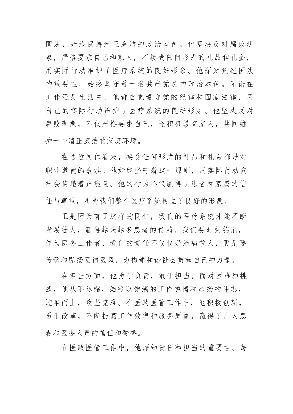 縣衛(wèi)計委醫(yī)政醫(yī)管股股長忠誠干凈擔當好干部現(xiàn)實表現(xiàn)材料在我們偉大的時代,每一個崗位上都有那么一些人,他們默默奉獻,用實際行動詮釋著忠誠、干凈、擔當?shù)木駜群=裉煳乙榻B的這位干部,就是這樣一位典型的代表。作為縣衛(wèi)計委醫(yī)政醫(yī)管股股長,他始終堅守初心,牢記使命,以人民健康為中心,不斷提升醫(yī)療服務水平。他深知醫(yī)療衛(wèi)生事業(yè)的重要性和復雜性,因此,在工作中,他始終保持高度的責任感和使命感,以嚴謹?shù)膽B(tài)度和扎實的專業(yè)知識,推動醫(yī)政醫(yī)管工作的順利開展。在忠誠方面,他始終堅守黨的信仰,對黨忠誠老實,言行一致。他深入學習黨的理論,不斷增強黨性修...