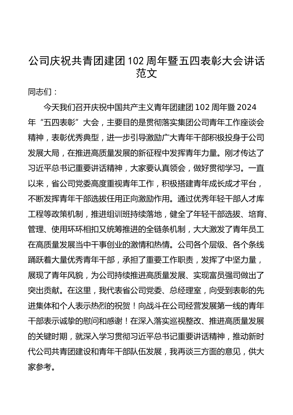 公司慶祝共青團(tuán)建團(tuán)102周年暨五四表彰大會講話VIP免費(fèi)