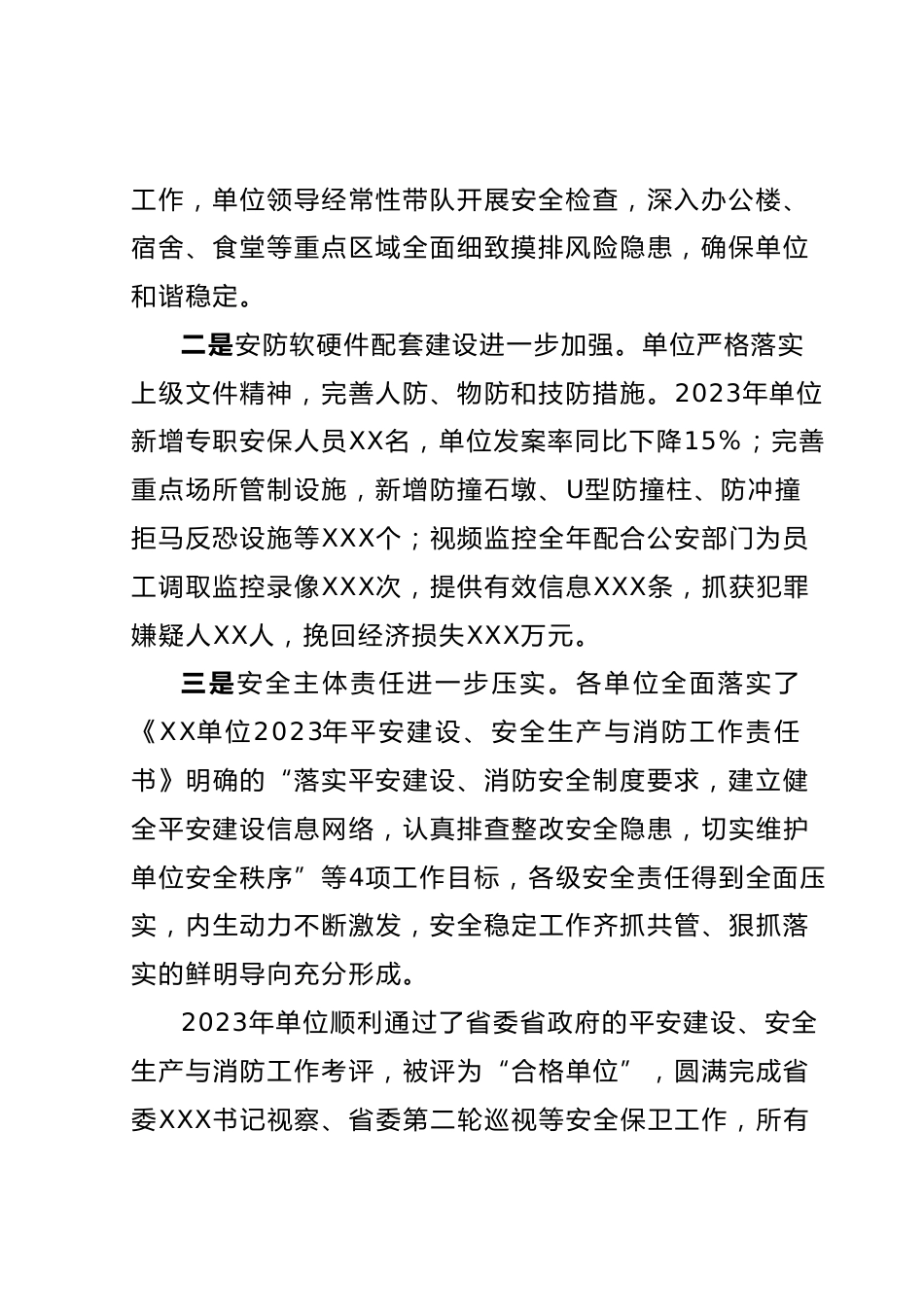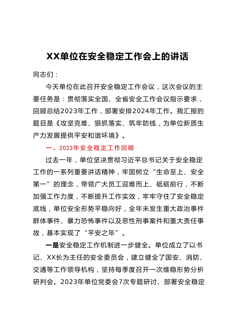 XX單位在安全穩(wěn)定工作會上的講話同志們:今天單位在此召開安全穩(wěn)定工作會議,這次會議的主要任務(wù)是:貫徹落實(shí)全國、全省安全工作會議指示要求,回顧總結(jié)2023年工作,部署安排2024年工作。我匯報(bào)的題目是《攻堅(jiān)克難、狠抓落實(shí)、筑牢防線,為單位新質(zhì)生產(chǎn)力發(fā)展提供平安和諧環(huán)境》。一、2023年安全穩(wěn)定工作回顧過去一年,單位堅(jiān)決貫徹習(xí)近平總書記關(guān)于安全穩(wěn)定工作的一系列重要講話精神,牢固樹立“生命至上、安全第一”的理念,帶領(lǐng)廣大員工迎難而上、砥礪前行,不斷加強(qiáng)工作力度,不斷提升工作實(shí)效,牢牢守住了安全穩(wěn)定底線,單位安全形勢平穩(wěn)向好,全年未發(fā)生重大政治事...