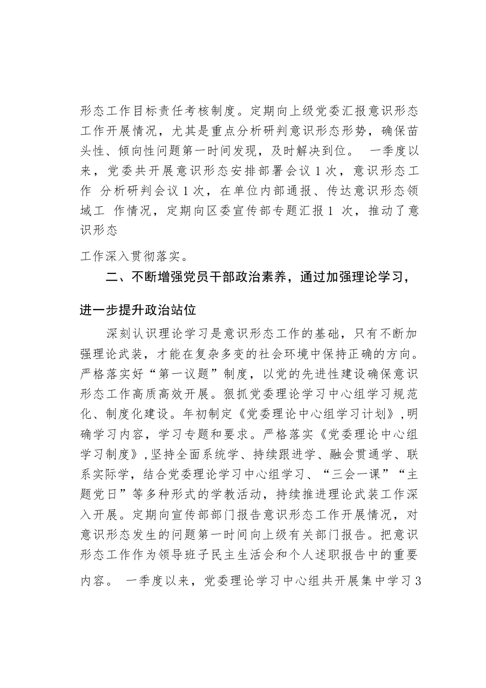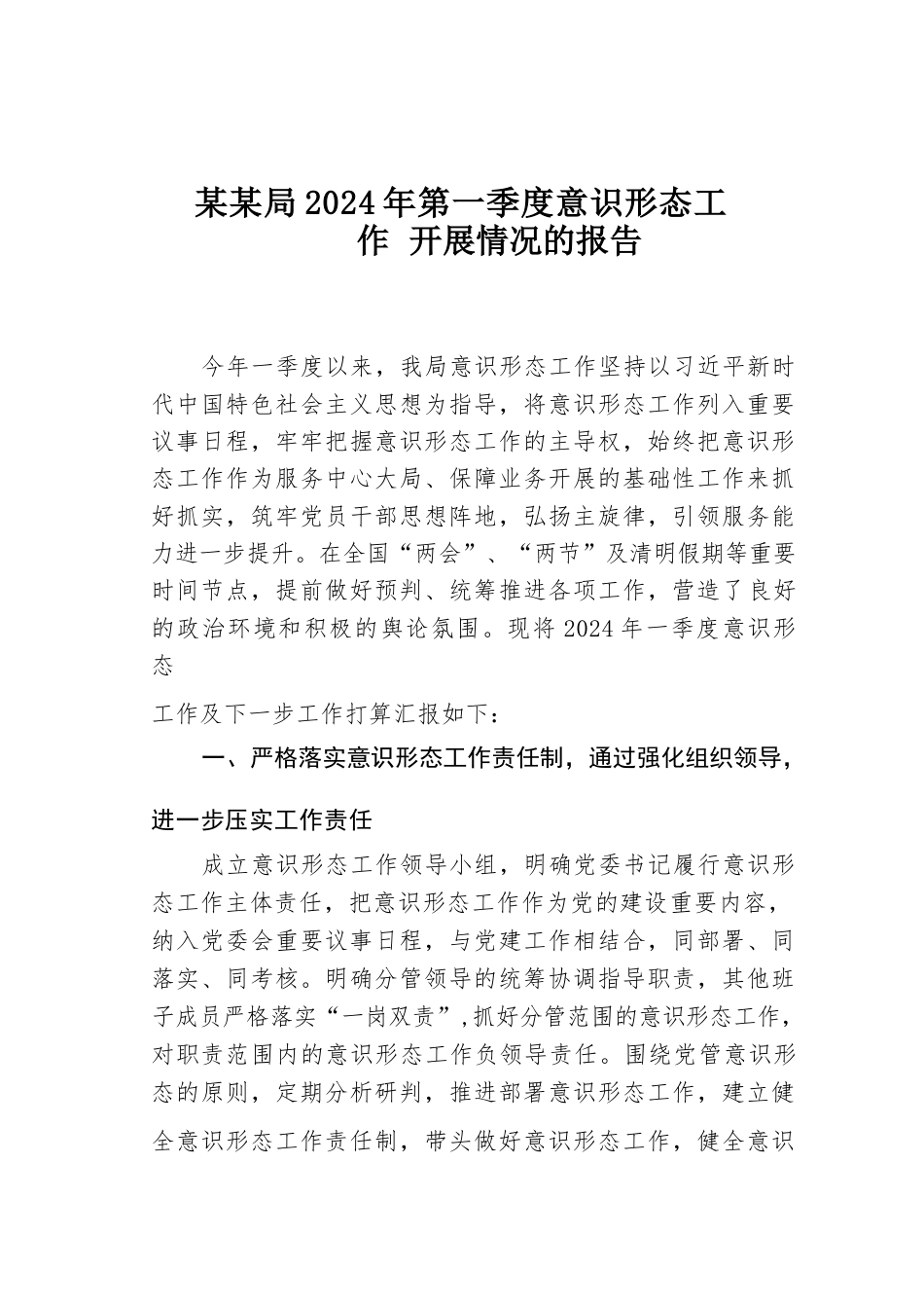 某某局2024年第一季度意識(shí)形態(tài)工作開展情況的報(bào)告今年一季度以來(lái),我局意識(shí)形態(tài)工作堅(jiān)持以習(xí)近平新時(shí)代中國(guó)特色社會(huì)主義思想為指導(dǎo),將意識(shí)形態(tài)工作列入重要議事日程,牢牢把握意識(shí)形態(tài)工作的主導(dǎo)權(quán),始終把意識(shí)形態(tài)工作作為服務(wù)中心大局、保障業(yè)務(wù)開展的基礎(chǔ)性工作來(lái)抓好抓實(shí),筑牢黨員干部思想陣地,弘揚(yáng)主旋律,引領(lǐng)服務(wù)能力進(jìn)一步提升。在全國(guó)“兩會(huì)”、“兩節(jié)”及清明假期等重要時(shí)間節(jié)點(diǎn),提前做好預(yù)判、統(tǒng)籌推進(jìn)各項(xiàng)工作,營(yíng)造了良好的政治環(huán)境和積極的輿論氛圍?,F(xiàn)將2024年一季度意識(shí)形態(tài)工作及下一步工作打算匯報(bào)如下:一、嚴(yán)格落實(shí)意識(shí)形態(tài)工作責(zé)任制,通過強(qiáng)化...