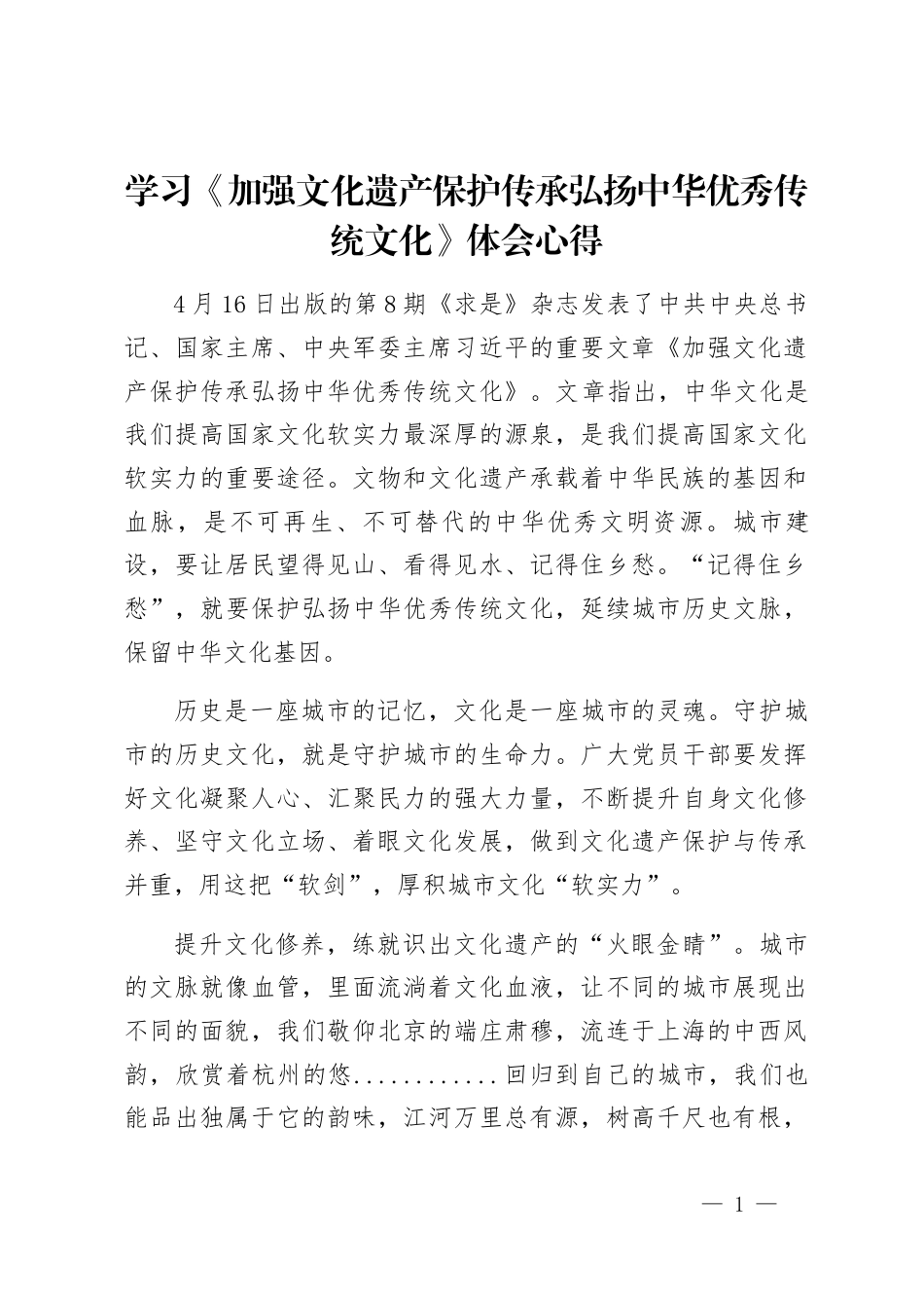 學(xué)習(xí)《加強(qiáng)文化遺產(chǎn)保護(hù)傳承弘揚(yáng)中華優(yōu)秀傳統(tǒng)文化》體會(huì)心得4月16日出版的第8期《求是》雜志發(fā)表了中共中央總書記、國(guó)家主席、中央軍委主席習(xí)近平的重要文章《加強(qiáng)文化遺產(chǎn)保護(hù)傳承弘揚(yáng)中華優(yōu)秀傳統(tǒng)文化》。文章指出,中華文化是我們提高國(guó)家文化軟實(shí)力最深厚的源泉,是我們提高國(guó)家文化軟實(shí)力的重要途徑。文物和文化遺產(chǎn)承載著中華民族的基因和血脈,是不可再生、不可替代的中華優(yōu)秀文明資源。城市建設(shè),要讓居民望得見山、看得見水、記得住鄉(xiāng)愁?!坝浀米∴l(xiāng)愁”,就要保護(hù)弘揚(yáng)中華優(yōu)秀傳統(tǒng)文化,延續(xù)城市歷史文脈,保留中華文化基因。歷史是一座城市的記憶,文化是一座...