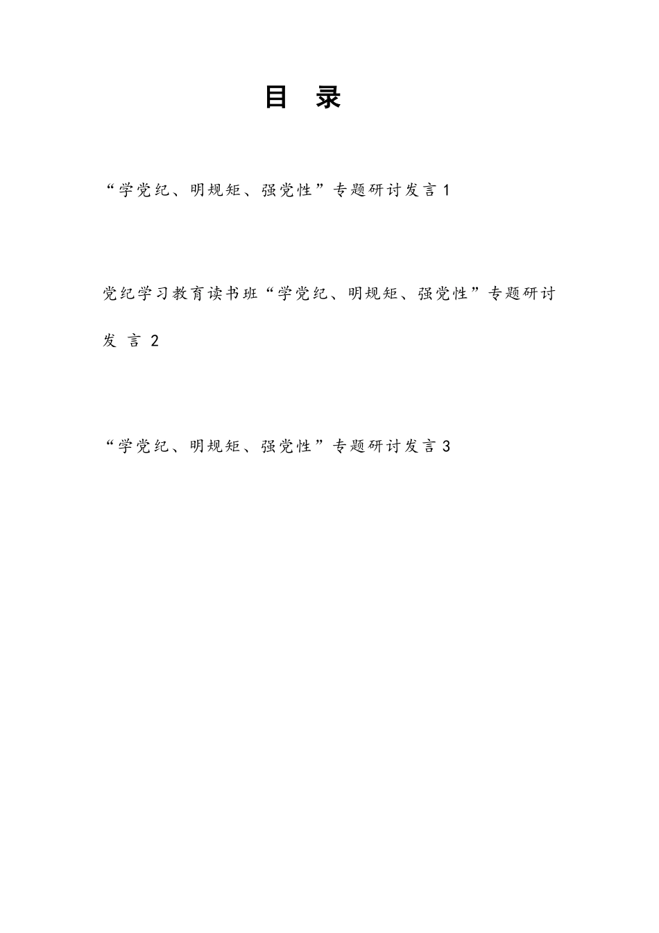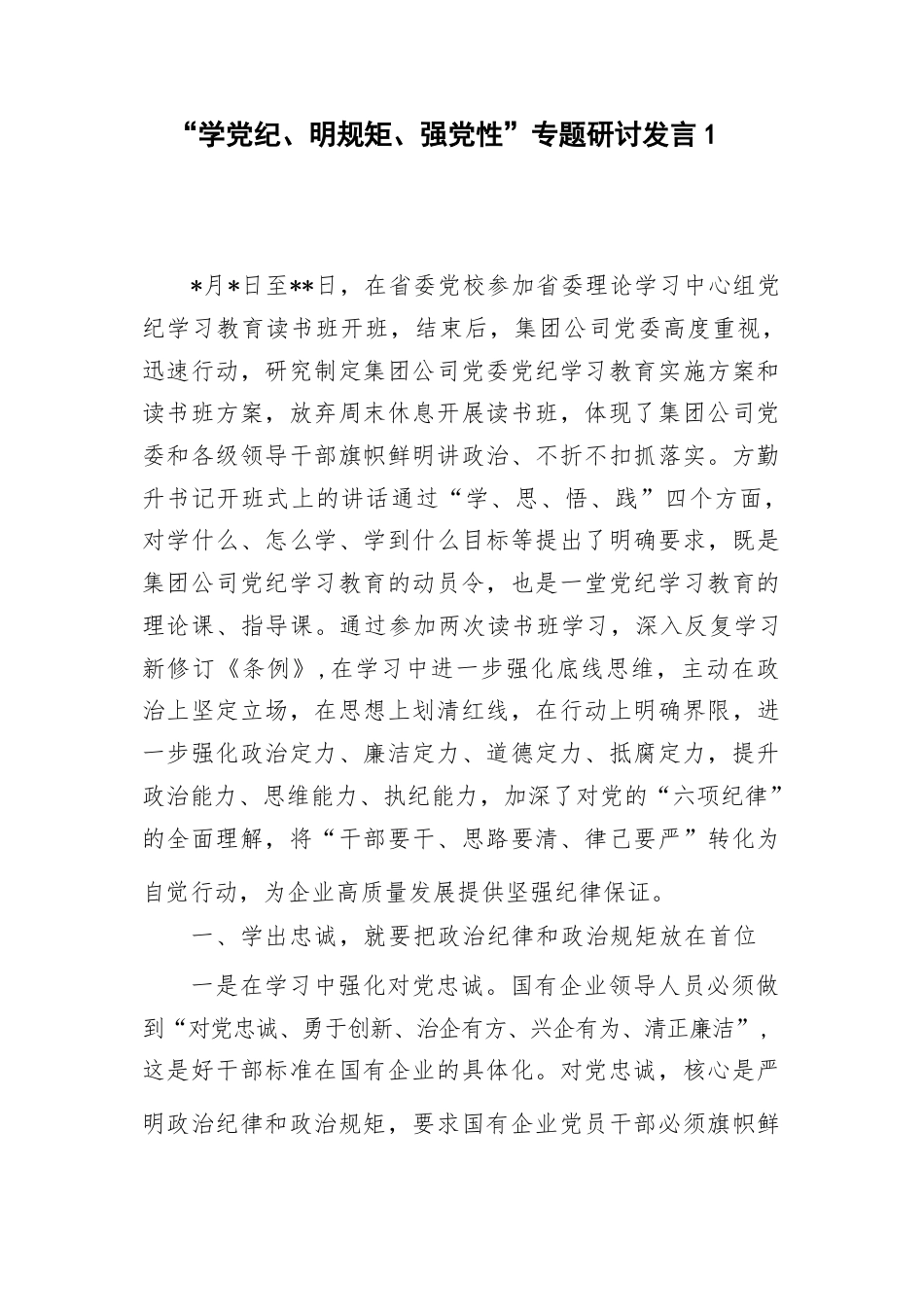 目錄“學(xué)黨紀(jì)、明規(guī)矩、強(qiáng)黨性”專題研討發(fā)言1黨紀(jì)學(xué)習(xí)教育讀書班“學(xué)黨紀(jì)、明規(guī)矩、強(qiáng)黨性”專題研討發(fā)言2“學(xué)黨紀(jì)、明規(guī)矩、強(qiáng)黨性”專題研討發(fā)言3“學(xué)黨紀(jì)、明規(guī)矩、強(qiáng)黨性”專題研討發(fā)言1*月*日至**日,在省委黨校參加省委理論學(xué)習(xí)中心組黨紀(jì)學(xué)習(xí)教育讀書班開班,結(jié)束后,集團(tuán)公司黨委高度重視,迅速行動,研究制定集團(tuán)公司黨委黨紀(jì)學(xué)習(xí)教育實(shí)施方案和讀書班方案,放棄周末休息開展讀書班,體現(xiàn)了集團(tuán)公司黨委和各級領(lǐng)導(dǎo)干部旗幟鮮明講政治、不折不扣抓落實(shí)。方勤升書記開班式上的講話通過“學(xué)、思、悟、踐”四個方面,對學(xué)什么、怎么學(xué)、學(xué)到什么目標(biāo)等提出了明確要...