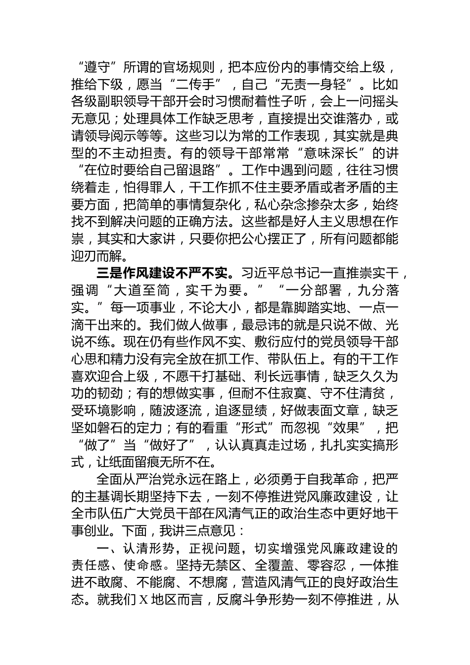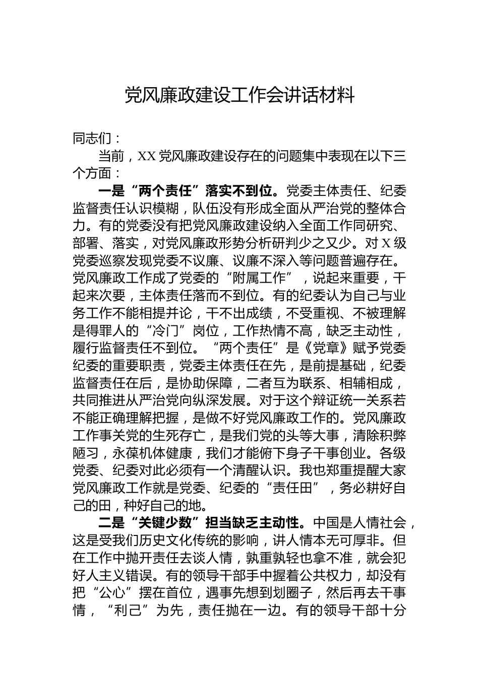 黨風廉政建設(shè)工作會講話材料同志們:當前,XX黨風廉政建設(shè)存在的問題集中表現(xiàn)在以下三個方面:一是“兩個責任”落實不到位。黨委主體責任、紀委監(jiān)督責任認識模糊,隊伍沒有形成全面從嚴治黨的整體合力。有的黨委沒有把黨風廉政建設(shè)納入全面工作同研究、部署、落實,對黨風廉政形勢分析研判少之又少。對X級黨委巡察發(fā)現(xiàn)黨委不議廉、議廉不深入等問題普遍存在。黨風廉政工作成了黨委的“附屬工作”,說起來重要,干起來次要,主體責任落而不到位。有的紀委認為自己與業(yè)務工作不能相提并論,干不出成績,不受重視、不被理解是得罪人的“冷門”崗位,工作熱情不高,缺乏主動...