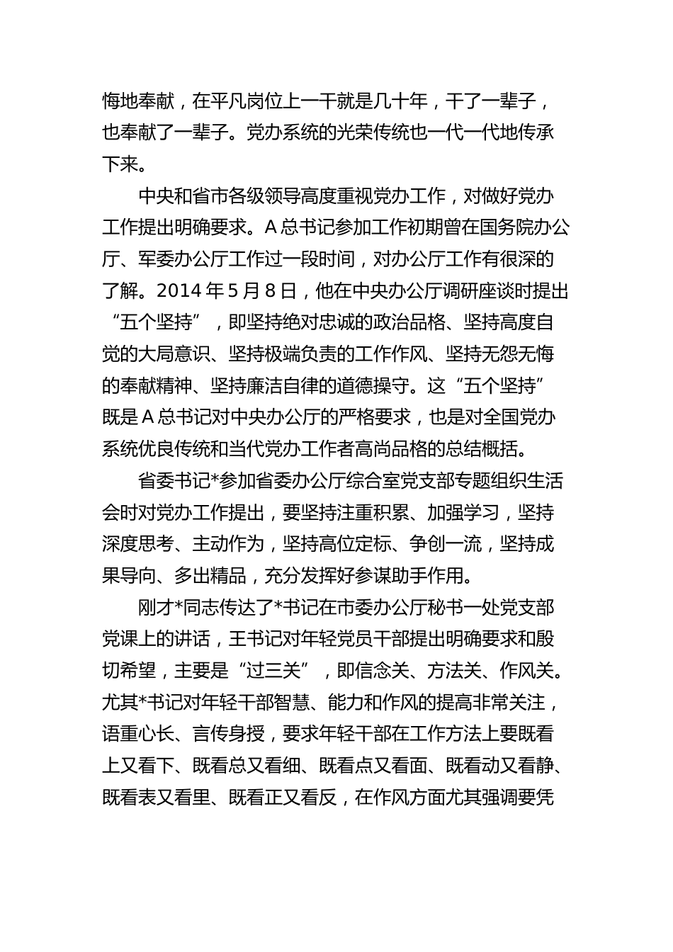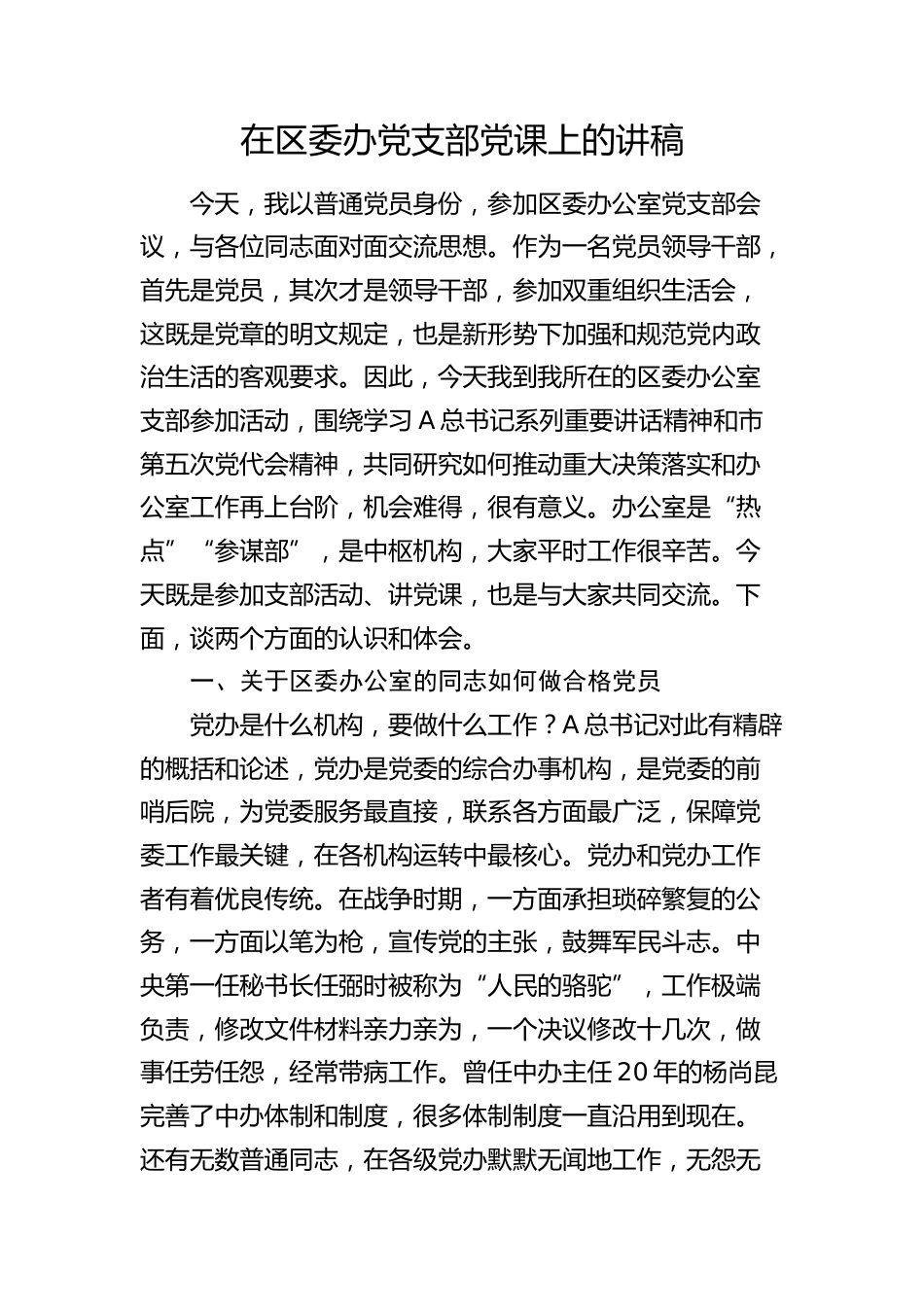 在區(qū)委辦黨支部黨課上的講稿今天,我以普通黨員身份,參加區(qū)委辦公室黨支部會議,與各位同志面對面交流思想。作為一名黨員領(lǐng)導(dǎo)干部,首先是黨員,其次才是領(lǐng)導(dǎo)干部,參加雙重組織生活會,這既是黨章的明文規(guī)定,也是新形勢下加強和規(guī)范黨內(nèi)政治生活的客觀要求。因此,今天我到我所在的區(qū)委辦公室支部參加活動,圍繞學(xué)習A總書記系列重要講話精神和市第五次黨代會精神,共同研究如何推動重大決策落實和辦公室工作再上臺階,機會難得,很有意義。辦公室是“熱點”“參謀部”,是中樞機構(gòu),大家平時工作很辛苦。今天既是參加支部活動、講黨課,也是與大家共同交流。下面,談...