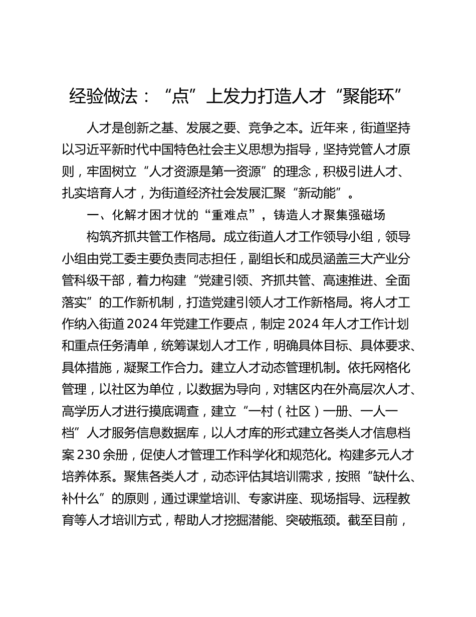 經(jīng)驗(yàn)做法:“點(diǎn)”上發(fā)力打造人才“聚能環(huán)”人才是創(chuàng)新之基、發(fā)展之要、競(jìng)爭(zhēng)之本。近年來,街道堅(jiān)持以習(xí)近平新時(shí)代中國(guó)特色社會(huì)主義思想為指導(dǎo),堅(jiān)持黨管人才原則,牢固樹立“人才資源是第一資源”的理念,積極引進(jìn)人才、扎實(shí)培育人才,為街道經(jīng)濟(jì)社會(huì)發(fā)展匯聚“新動(dòng)能”。一、化解才困才憂的“重難點(diǎn)”,鑄造人才聚集強(qiáng)磁場(chǎng)構(gòu)筑齊抓共管工作格局。成立街道人才工作領(lǐng)導(dǎo)小組,領(lǐng)導(dǎo)小組由黨工委主要負(fù)責(zé)同志擔(dān)任,副組長(zhǎng)和成員涵蓋三大產(chǎn)業(yè)分管科級(jí)干部,著力構(gòu)建“黨建引領(lǐng)、齊抓共管、高速推進(jìn)、全面落實(shí)”的工作新機(jī)制,打造黨建引領(lǐng)人才工作新格局。將人才工作納入街道...