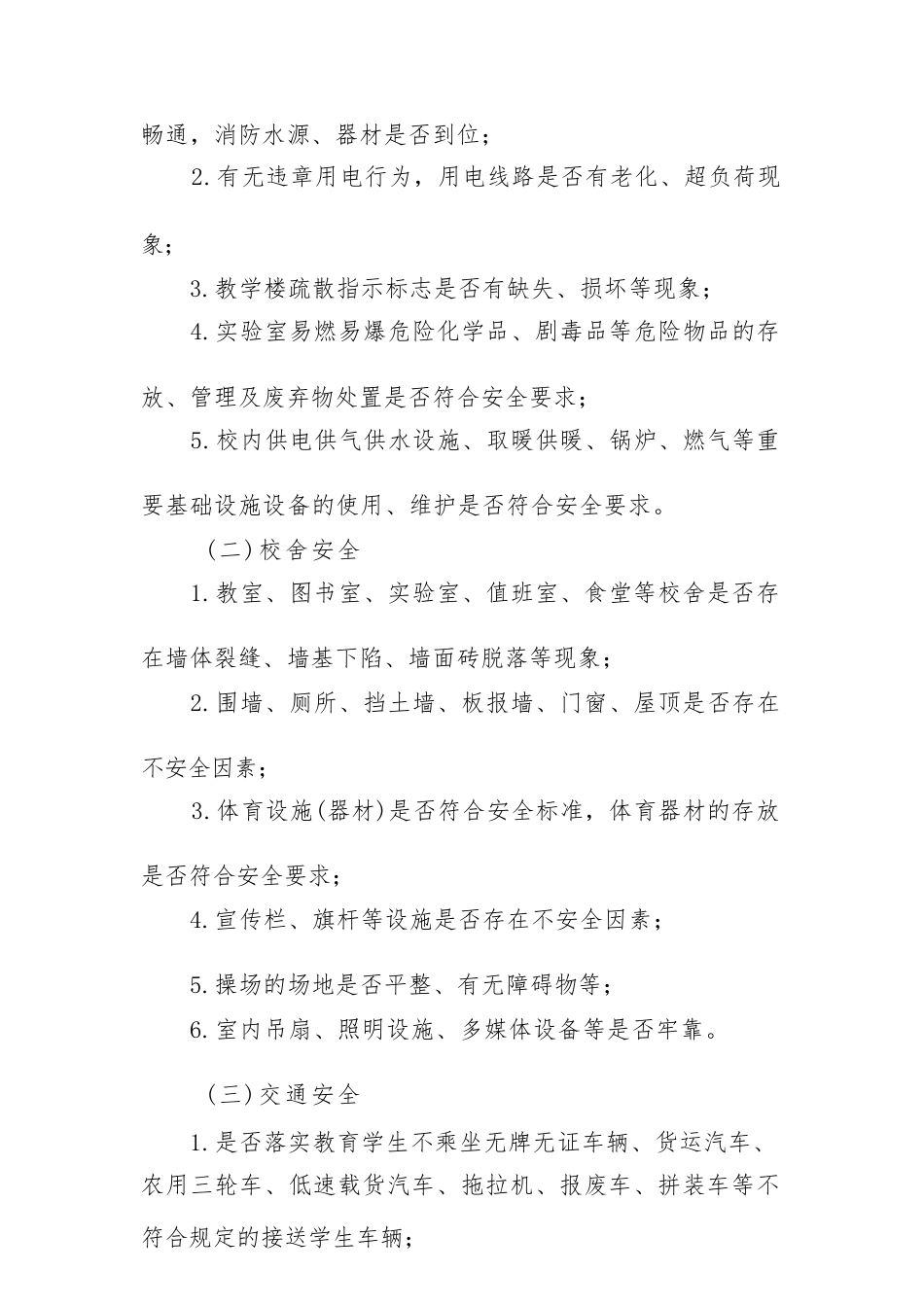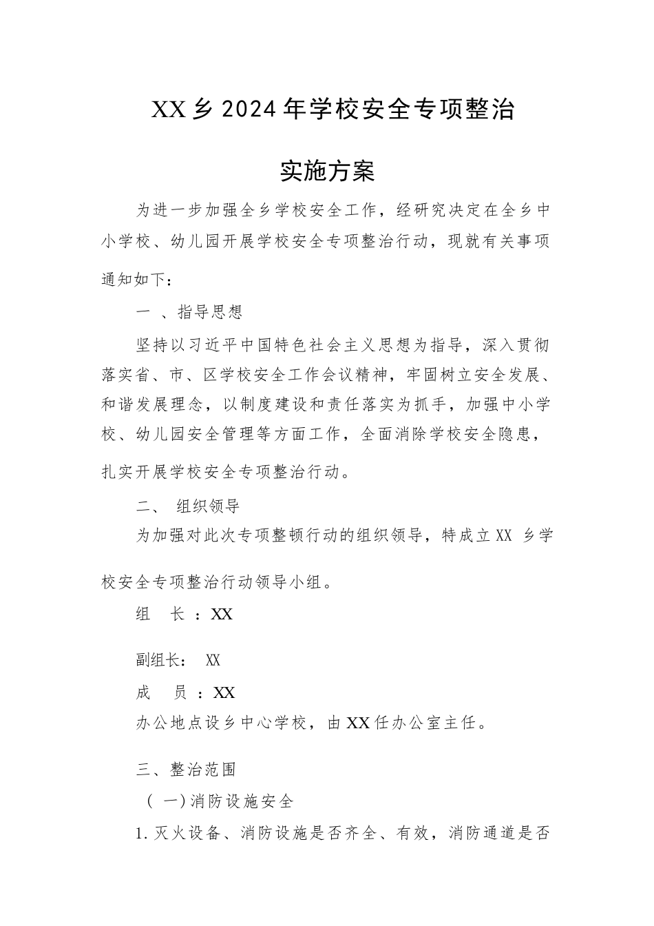 XX鄉(xiāng)2024年學(xué)校安全專項(xiàng)整治實(shí)施方案為進(jìn)一步加強(qiáng)全鄉(xiāng)學(xué)校安全工作,經(jīng)研究決定在全鄉(xiāng)中小學(xué)校、幼兒園開展學(xué)校安全專項(xiàng)整治行動(dòng),現(xiàn)就有關(guān)事項(xiàng)通知如下:一、指導(dǎo)思想堅(jiān)持以習(xí)近平中國(guó)特色社會(huì)主義思想為指導(dǎo),深入貫徹落實(shí)省、市、區(qū)學(xué)校安全工作會(huì)議精神,牢固樹立安全發(fā)展、和諧發(fā)展理念,以制度建設(shè)和責(zé)任落實(shí)為抓手,加強(qiáng)中小學(xué)校、幼兒園安全管理等方面工作,全面消除學(xué)校安全隱患,扎實(shí)開展學(xué)校安全專項(xiàng)整治行動(dòng)。二、組織領(lǐng)導(dǎo)為加強(qiáng)對(duì)此次專項(xiàng)整頓行動(dòng)的組織領(lǐng)導(dǎo),特成立XX鄉(xiāng)學(xué)校安全專項(xiàng)整治行動(dòng)領(lǐng)導(dǎo)小組。組長(zhǎng):XX副組長(zhǎng):XX成員:XX辦公地點(diǎn)設(shè)鄉(xiāng)中心學(xué)校,由...