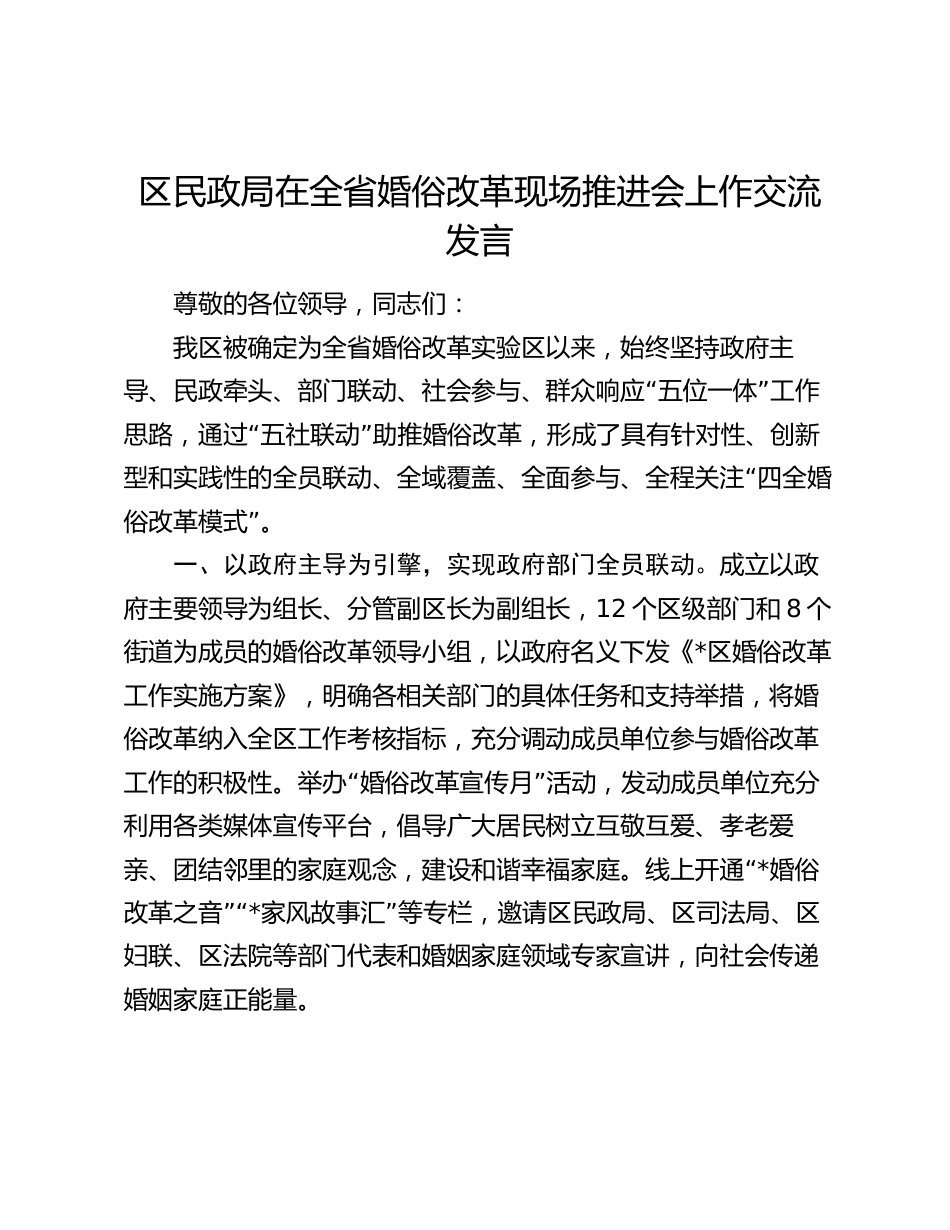 區(qū)民政局在全省婚俗改革現(xiàn)場推進會上作交流發(fā)言尊敬的各位領(lǐng)導(dǎo),同志們:我區(qū)被確定為全省婚俗改革實驗區(qū)以來,始終堅持政府主“”導(dǎo)、民政牽頭、部門聯(lián)動、社會參與、群眾響應(yīng)五位一體工作“”思路,通過五社聯(lián)動助推婚俗改革,形成了具有針對性、創(chuàng)新“型和實踐性的全員聯(lián)動、全域覆蓋、全面參與、全程關(guān)注四全婚”俗改革模式。一、以政府主導(dǎo)為引擎,實現(xiàn)政府部門全員聯(lián)動。成立以政府主要領(lǐng)導(dǎo)為組長、分管副區(qū)長為副組長,12個區(qū)級部門和8個街道為成員的婚俗改革領(lǐng)導(dǎo)小組,以政府名義下發(fā)《*區(qū)婚俗改革工作實施方案》,明確各相關(guān)部門的具體任務(wù)和支持舉措,將婚俗改...