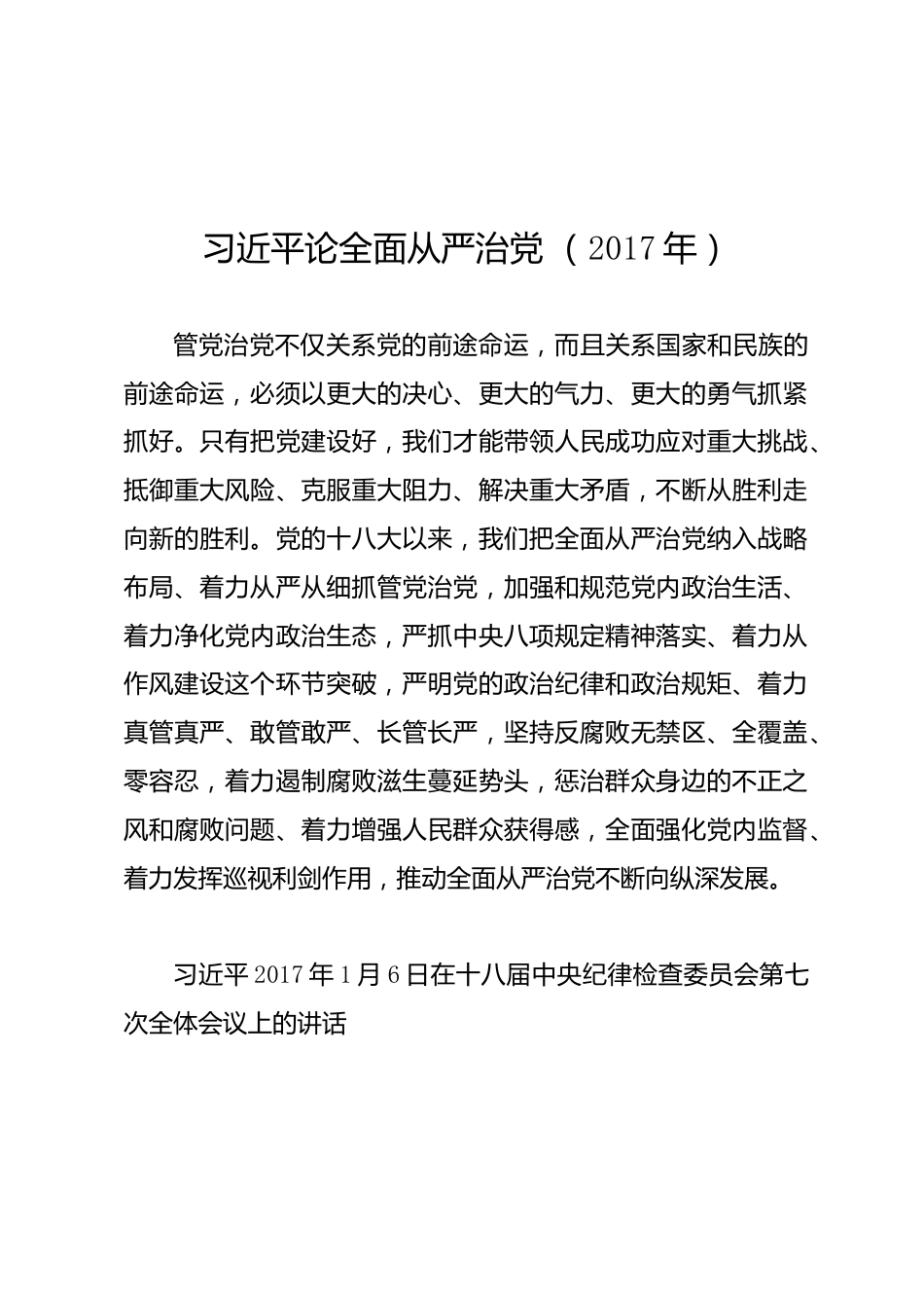 習近平論全面從嚴治黨(2017年)管黨治黨不僅關(guān)系黨的前途命運,而且關(guān)系國家和民族的前途命運,必須以更大的決心、更大的氣力、更大的勇氣抓緊抓好。只有把黨建設好,我們才能帶領(lǐng)人民成功應對重大挑戰(zhàn)、抵御重大風險、克服重大阻力、解決重大矛盾,不斷從勝利走向新的勝利。黨的十八大以來,我們把全面從嚴治黨納入戰(zhàn)略布局、著力從嚴從細抓管黨治黨,加強和規(guī)范黨內(nèi)政治生活、著力凈化黨內(nèi)政治生態(tài),嚴抓中央八項規(guī)定精神落實、著力從作風建設這個環(huán)節(jié)突破,嚴明黨的政治紀律和政治規(guī)矩、著力真管真嚴、敢管敢嚴、長管長嚴,堅持反腐敗無禁區(qū)、全覆蓋、零容忍,著力遏...