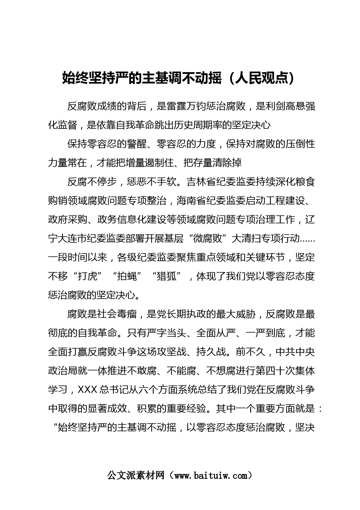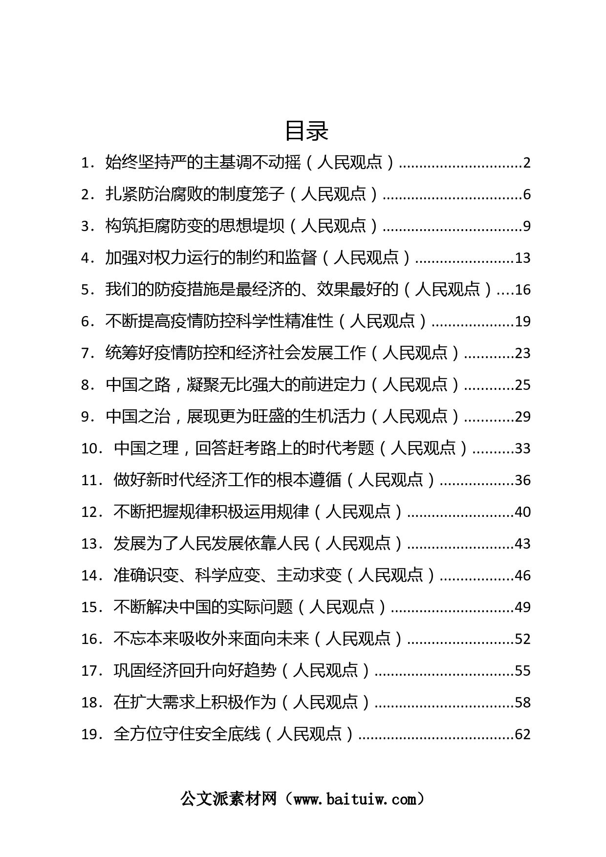 目錄1.始終堅持嚴(yán)的主基調(diào)不動搖(人民觀點(diǎn))..............................22.扎緊防治腐敗的制度籠子(人民觀點(diǎn))..................................63.構(gòu)筑拒腐防變的思想堤壩(人民觀點(diǎn))..................................94.加強(qiáng)對權(quán)力運(yùn)行的制約和監(jiān)督(人民觀點(diǎn))........................135.我們的防疫措施是最經(jīng)濟(jì)的、效果最好的(人民觀點(diǎn))....166.不斷提高疫情防控科學(xué)性精準(zhǔn)性(人民觀點(diǎn))....................197.統(tǒng)籌好疫情防控和經(jīng)濟(jì)社會發(fā)展工作(人民觀點(diǎn))............238.中國之路,凝聚無比強(qiáng)大的前進(jìn)定力(人民觀點(diǎn))............259...
