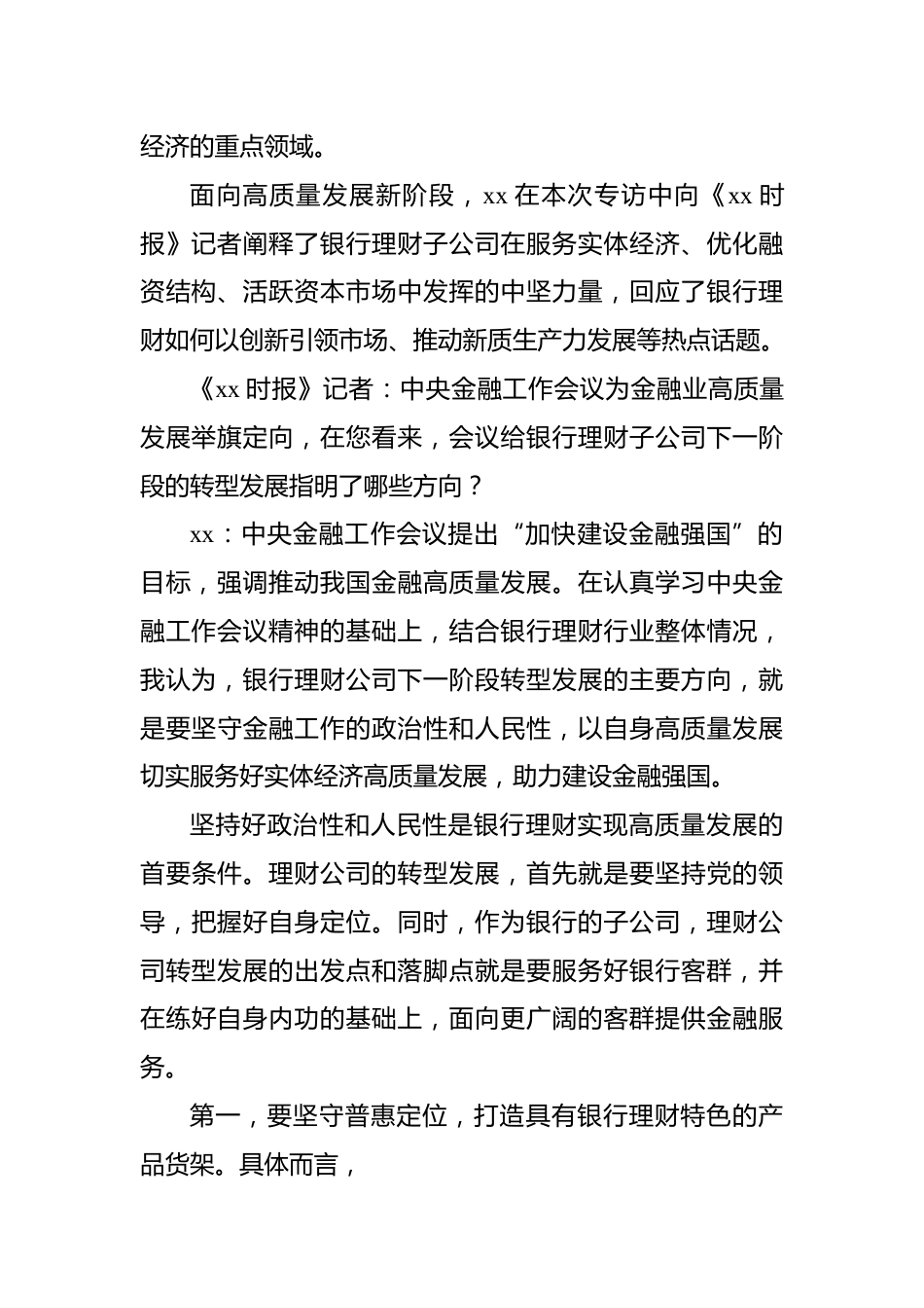 董事長(zhǎng)關(guān)于加快發(fā)展新質(zhì)生產(chǎn)力以創(chuàng)新引領(lǐng)理財(cái)公司高質(zhì)量發(fā)展主題講話(huà)去年底召開(kāi)的中央金融工作會(huì)議,擘畫(huà)了建設(shè)金融強(qiáng)國(guó)的宏偉藍(lán)圖,強(qiáng)調(diào)堅(jiān)定不移走中國(guó)特色金融發(fā)展之路,為金融業(yè)發(fā)展舉旗定向。作為金融體系的重要組成部分,資產(chǎn)管理行業(yè)也肩負(fù)著推動(dòng)金融業(yè)高質(zhì)量發(fā)展、服務(wù)實(shí)體經(jīng)濟(jì)和人民美好生活的重任?!般y行理財(cái)子公司要以更高的政治站位和發(fā)展格局,將自身高質(zhì)量發(fā)展融入服務(wù)共同富裕及實(shí)體經(jīng)濟(jì)的大局之中。”近日,興銀理財(cái)黨委書(shū)記、董事長(zhǎng)xx接受《xx時(shí)報(bào)》記者專(zhuān)訪,詳解了銀行理財(cái)子公司服務(wù)實(shí)體經(jīng)濟(jì)高質(zhì)量發(fā)展的具體路徑?!拔磥?lái),興銀理財(cái)要聚焦‘區(qū)域’‘...
