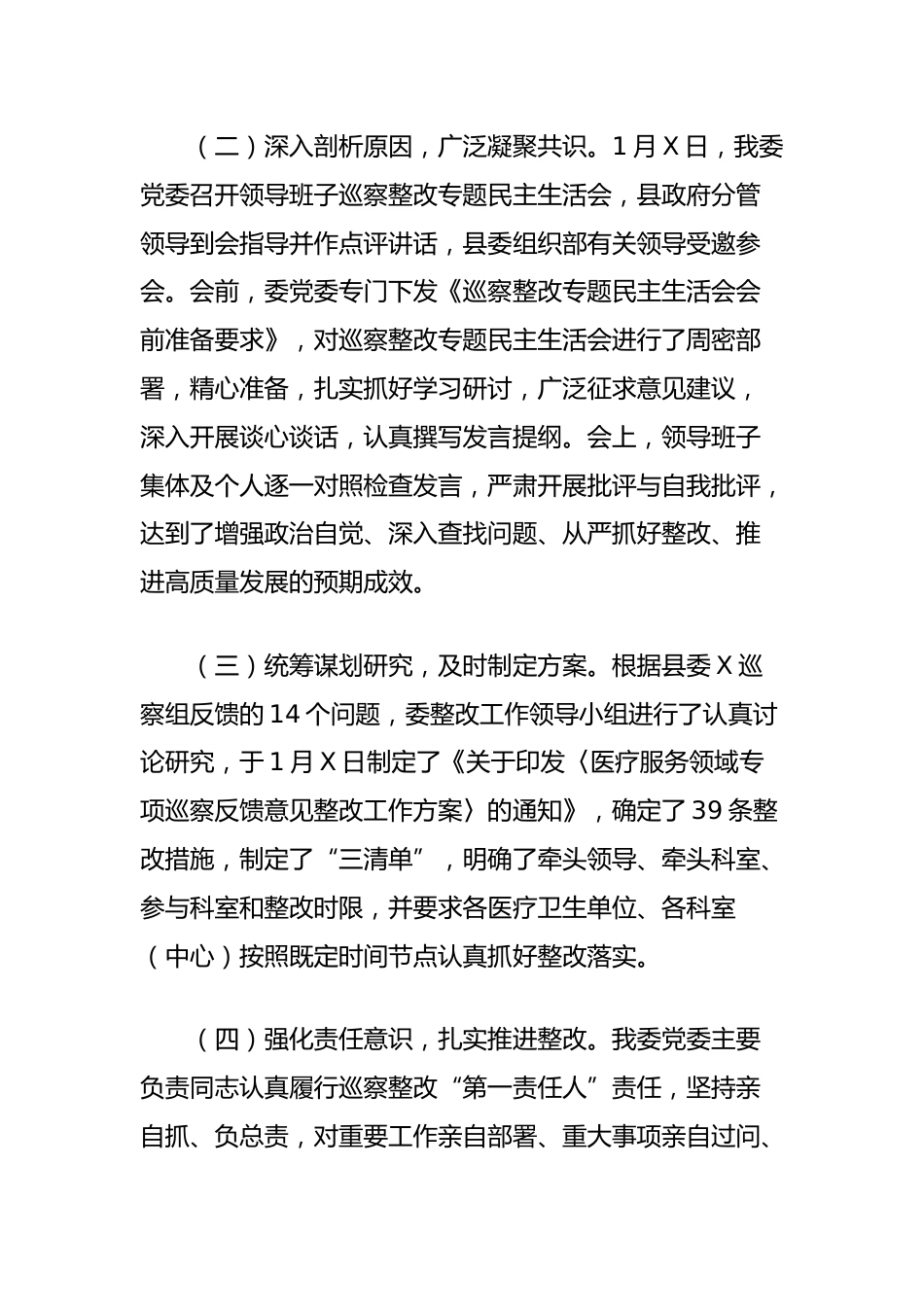 縣委巡察組關(guān)于醫(yī)療服務(wù)領(lǐng)域?qū)m?xiàng)巡察整改情況報(bào)告根據(jù)縣委統(tǒng)一部署,縣委X巡察組于2023年X月X日至X月X日對(duì)縣人民醫(yī)院、縣第X人民醫(yī)院、縣第X人民醫(yī)院、X中心衛(wèi)生院、X衛(wèi)生院等5家醫(yī)院開(kāi)展了醫(yī)療服務(wù)領(lǐng)域?qū)m?xiàng)巡察,并于2023年X月X日進(jìn)行了反饋。根據(jù)黨務(wù)公開(kāi)原則和巡察工作有關(guān)要求,現(xiàn)將巡察整改情況報(bào)告如下。一、整改工作組織情況(一)抬高政治站位,迅速動(dòng)員部署。我委黨委高度重視醫(yī)療服務(wù)領(lǐng)域?qū)m?xiàng)巡察反饋意見(jiàn)整改落實(shí)工作,將其作為當(dāng)前一項(xiàng)重大政治任務(wù)來(lái)抓,于今年1月X日召開(kāi)了巡察整改工作專題部署會(huì),認(rèn)真貫徹落實(shí)縣委巡察整改要求,進(jìn)一步統(tǒng)一思想認(rèn)識(shí),切實(shí)...