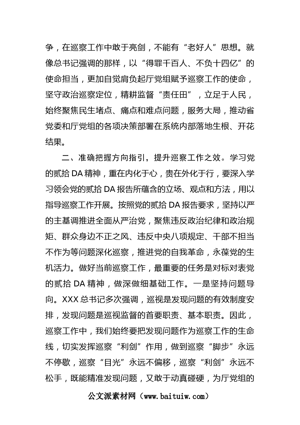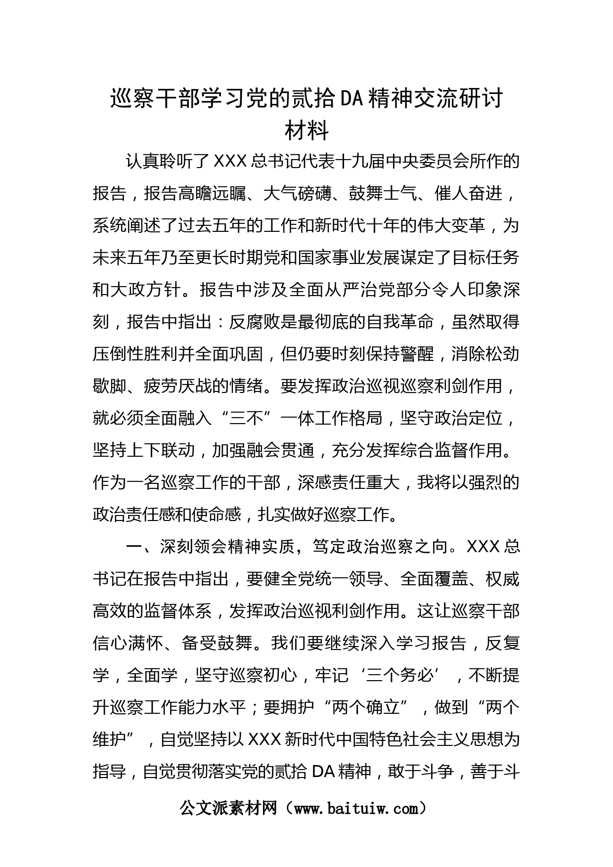 巡察干部學(xué)習(xí)黨的貳拾DA精神交流研討材料認(rèn)真聆聽了XXX總書記代表十九屆中央委員會(huì)所作的報(bào)告,報(bào)告高瞻遠(yuǎn)矚、大氣磅礴、鼓舞士氣、催人奮進(jìn),系統(tǒng)闡述了過去五年的工作和新時(shí)代十年的偉大變革,為未來五年乃至更長時(shí)期黨和國家事業(yè)發(fā)展謀定了目標(biāo)任務(wù)和大政方針。報(bào)告中涉及全面從嚴(yán)治黨部分令人印象深刻,報(bào)告中指出:反腐敗是最徹底的自我革命,雖然取得壓倒性勝利并全面鞏固,但仍要時(shí)刻保持警醒,消除松勁歇腳、疲勞厭戰(zhàn)的情緒。要發(fā)揮政治巡視巡察利劍作用,就必須全面融入“三不”一體工作格局,堅(jiān)守政治定位,堅(jiān)持上下聯(lián)動(dòng),加強(qiáng)融會(huì)貫通,充分發(fā)揮綜合監(jiān)督作用...