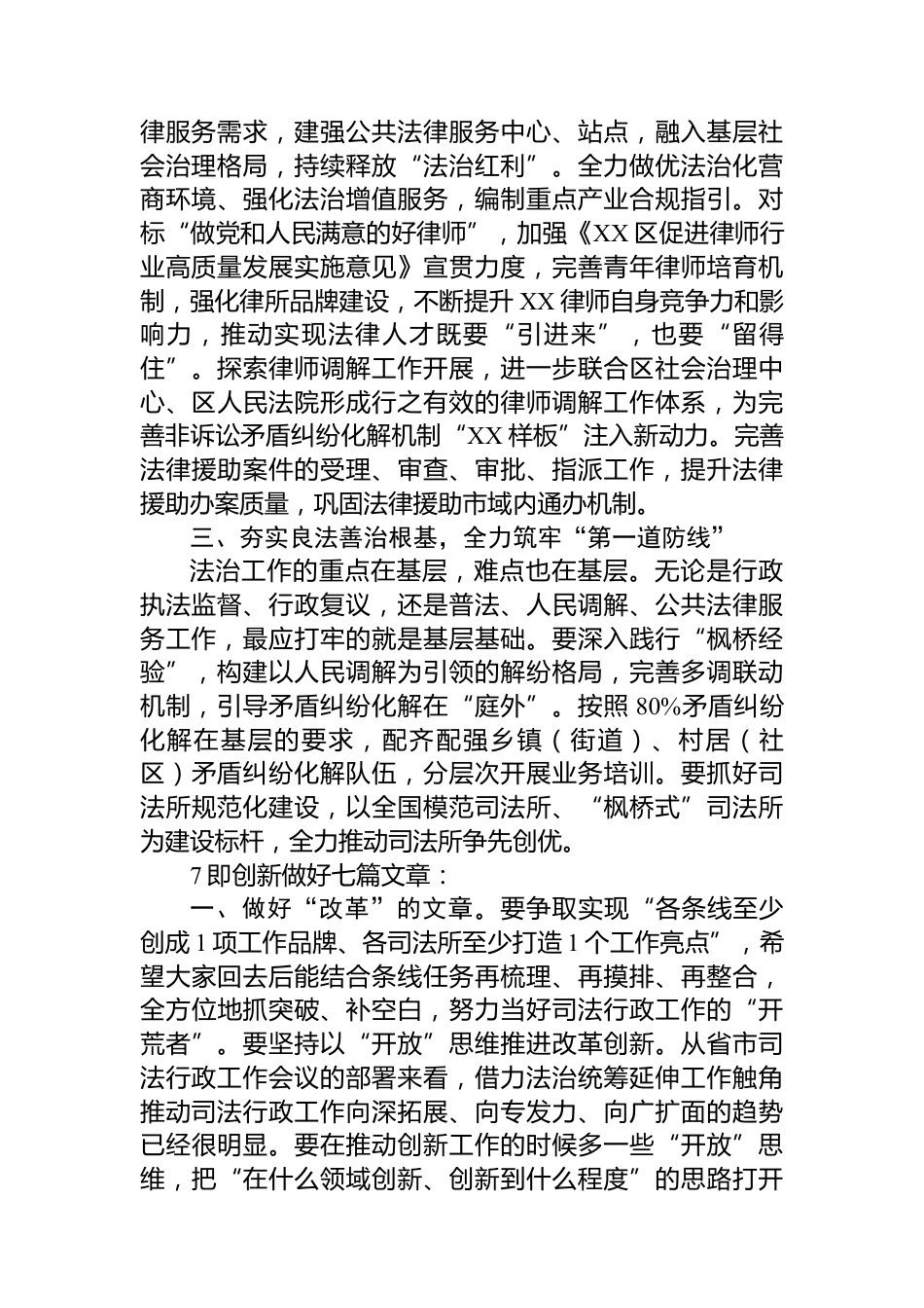 區(qū)司法局2024年度工作計劃2024年工作的總體要求是:堅持以習近平新時代中國特色社會主義思想為指導,以深學篤行習近平法治思想為主題主線,為主攻“一千雙百”、實施“六大戰(zhàn)略”、打造全面建設共同富裕區(qū)域標桿標志性成果,注入強勁的法治動能。緊扣一條主線,全力夯實三大根基、創(chuàng)新做好7篇文章(即“1、3、7”行動),認真書寫中國式法治現代化的XX篇章!1即一條主線:以深學篤行習近平法治思想為主題主線,以高水平法治保障高質量發(fā)展。3即夯實三個根基:一、夯實法治建設根基,拓展法治強區(qū)社會輻射力法治建設是一項集合立法、執(zhí)法、司法和守法職能全面推進的綜合性...