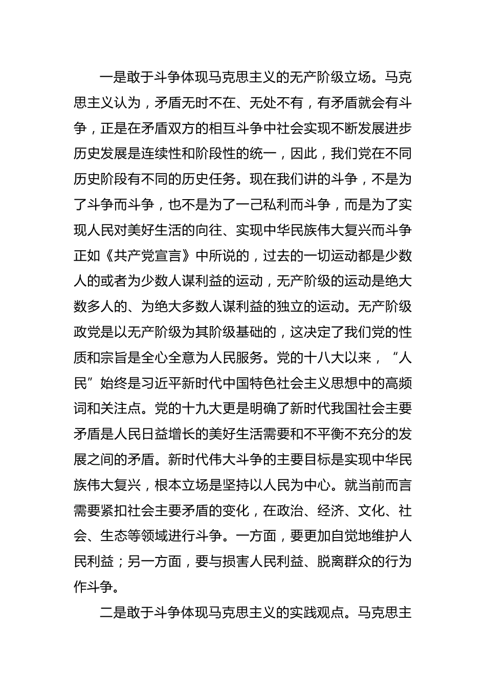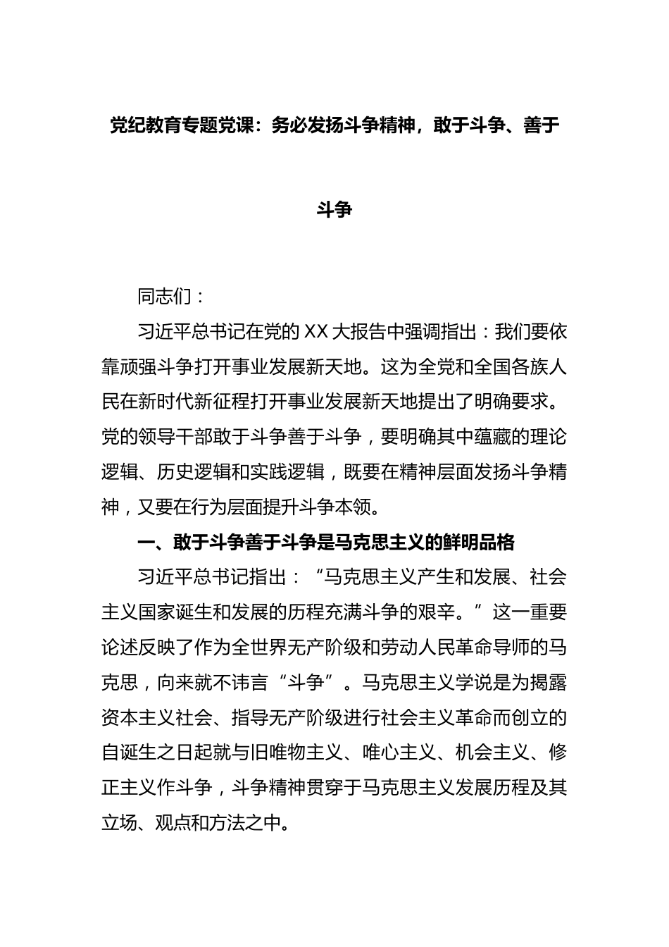 黨紀教育專題黨課:務(wù)必發(fā)揚斗爭精神,敢于斗爭、善于斗爭同志們:習(xí)近平總書記在黨的XX大報告中強調(diào)指出:我們要依靠頑強斗爭打開事業(yè)發(fā)展新天地。這為全黨和全國各族人民在新時代新征程打開事業(yè)發(fā)展新天地提出了明確要求。黨的領(lǐng)導(dǎo)干部敢于斗爭善于斗爭,要明確其中蘊藏的理論邏輯、歷史邏輯和實踐邏輯,既要在精神層面發(fā)揚斗爭精神,又要在行為層面提升斗爭本領(lǐng)。一、敢于斗爭善于斗爭是馬克思主義的鮮明品格習(xí)近平總書記指出:“馬克思主義產(chǎn)生和發(fā)展、社會主義國家誕生和發(fā)展的歷程充滿斗爭的艱辛。”這一重要論述反映了作為全世界無產(chǎn)階級和勞動人民革命導(dǎo)師的馬克...