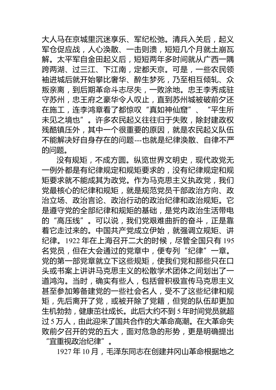 高校黨紀(jì)學(xué)習(xí)教育黨課講稿:守紀(jì)律講規(guī)矩今天,根據(jù)省委黨紀(jì)學(xué)習(xí)教育要求和學(xué)院實(shí)施方案安排,由我圍繞“守紀(jì)律講規(guī)矩”這個(gè)主題,給大家講黨課主要講三個(gè)方面。一、守紀(jì)律講規(guī)矩,中國(guó)共產(chǎn)黨治黨的法寶《求是》雜志發(fā)表過(guò)中共中央總書記、國(guó)家主席、中央軍委主席習(xí)近平的重要文章《推進(jìn)黨的建設(shè)新的偉大工程要一以貫之》。文章中總書記講的7個(gè)故事,深意十足。今天,跟大家分享集中的兩個(gè)故事。秦始皇統(tǒng)一天下后,窮奢極欲、揮霍無(wú)度,搜刮民財(cái)、征用民力,陳勝、吳廣揭竿而起,四方響應(yīng),函谷關(guān)被攻破,項(xiàng)羽放了一把火,富麗堂皇的阿房宮變成一片焦土。后人感嘆說(shuō):“...