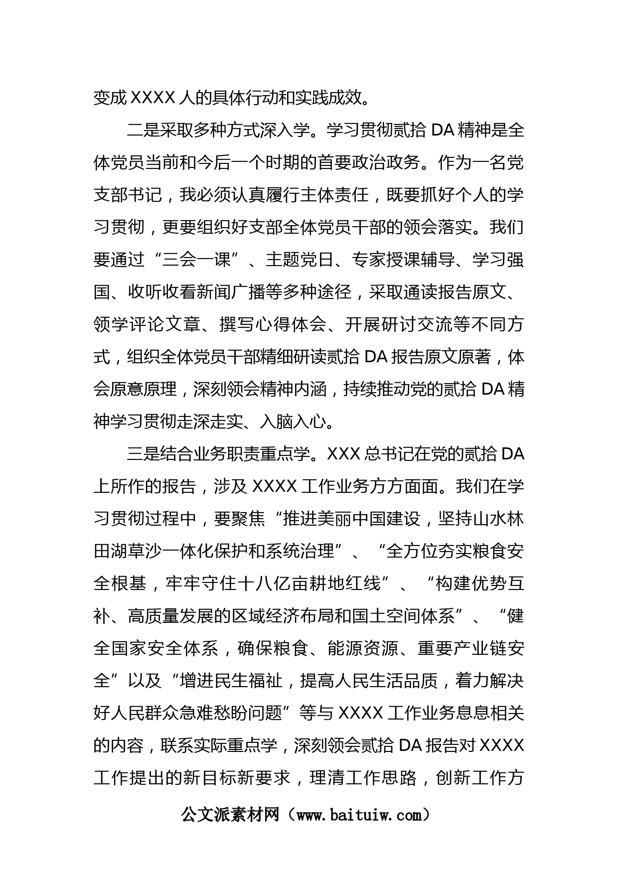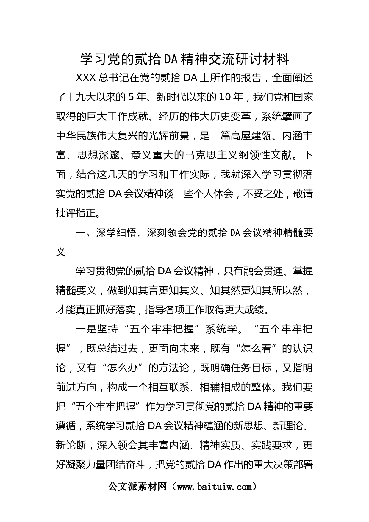 學(xué)習(xí)黨的貳拾DA精神交流研討材料XXX總書記在黨的貳拾DA上所作的報告,全面闡述了十九大以來的5年、新時代以來的10年,我們黨和國家取得的巨大工作成就、經(jīng)歷的偉大歷史變革,系統(tǒng)擘畫了中華民族偉大復(fù)興的光輝前景,是一篇高屋建瓴、內(nèi)涵豐富、思想深邃、意義重大的馬克思主義綱領(lǐng)性文獻(xiàn)。下面,結(jié)合這幾天的學(xué)習(xí)和工作實際,我就深入學(xué)習(xí)貫徹落實黨的貳拾DA會議精神談一些個人體會,不妥之處,敬請批評指正。一、深學(xué)細(xì)悟,深刻領(lǐng)會黨的貳拾DA會議精神精髓要義學(xué)習(xí)貫徹黨的貳拾DA會議精神,只有融會貫通、掌握精髓要義,做到知其言更知其義、知其然更知其所以然,才能真...