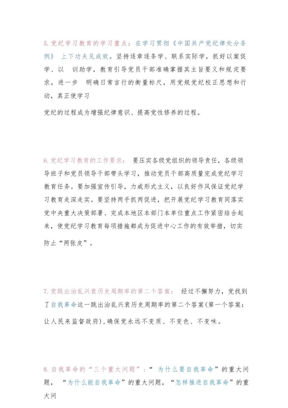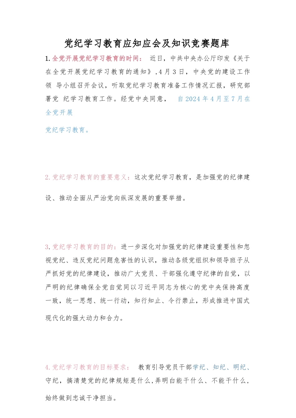 黨紀學(xué)習(xí)教育應(yīng)知應(yīng)會及知識競賽題庫1.全黨開展黨紀學(xué)習(xí)教育的時間:近日,中共中央辦公廳印發(fā)《關(guān)于在全黨開展黨紀學(xué)習(xí)教育的通知》,4月3日,中央黨的建設(shè)工作領(lǐng)導(dǎo)小組召開會議,聽取黨紀學(xué)習(xí)教育準備工作情況匯報,研究部署黨紀學(xué)習(xí)教育工作。經(jīng)黨中央同意,自2024年4月至7月在全黨開展黨紀學(xué)習(xí)教育。2.黨紀學(xué)習(xí)教育的重要意義:這次黨紀學(xué)習(xí)教育,是加強黨的紀律建設(shè)、推動全面從嚴治黨向縱深發(fā)展的重要舉措。3.黨紀學(xué)習(xí)教育的目的:進一步深化對加強黨的紀律建設(shè)重要性和忽視黨紀、違反黨紀問題危害性的認識,推動各級黨組織和領(lǐng)導(dǎo)班子從嚴抓好黨的紀律建設(shè),推動廣...