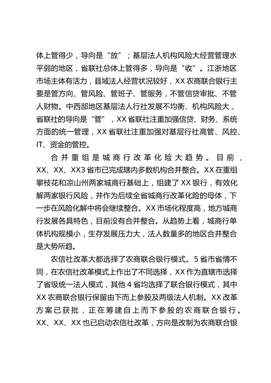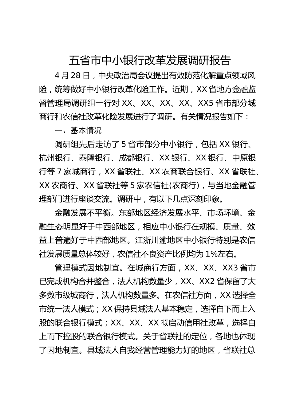 五省市中小銀行改革發(fā)展調(diào)研報告4月28日,中央政治局會議提出有效防范化解重點領域風險,統(tǒng)籌做好中小銀行改革化險工作。近期,XX省地方金融監(jiān)督管理局調(diào)研組一行對XX、XX、XX、XX、XX5省市部分城商行和農(nóng)信社改革化險發(fā)展進行了調(diào)研。有關情況報告如下:一、基本情況調(diào)研組先后走訪了5省市部分中小銀行,包括XX銀行、杭州銀行、泰隆銀行、成都銀行、XX銀行、XX銀行、中原銀行等7家城商行,XX省聯(lián)社、XX農(nóng)商聯(lián)合銀行、XX省聯(lián)社、XX農(nóng)商行、XX省聯(lián)社等5家農(nóng)信社(農(nóng)商行),與當?shù)亟鹑诠芾聿块T進行座談交流。調(diào)研中,有以下幾點深刻印象。金融發(fā)展不平衡。東部地區(qū)經(jīng)濟發(fā)展...