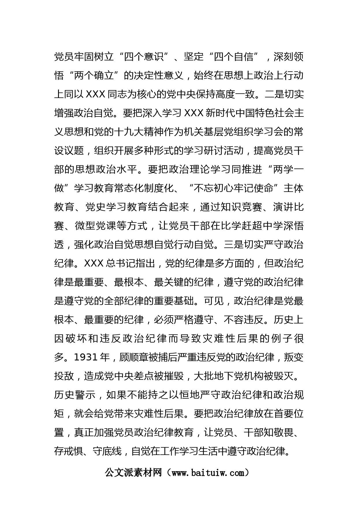 2022年黨建理論文章:練就“三門功夫”,提升機關基層黨組織組織力黨的十九大報告強調,要以提升組織力為重點,突出政治功能,把企業(yè)、農村、機關、學校、科研院所、街道社區(qū)、社會組織等基層黨組織建設成為宣傳黨的主張、貫徹黨的決定、領導基層治理、團結動員群眾、推動改革發(fā)展的堅強戰(zhàn)斗堡壘。以提升組織力為重點,這對新時代機關基層黨組織提出了新要求,也為加強機關基層黨組織建設指明了方向、提供了遵循。提升機關基層黨組織的組織力,要著力在突出政治建設、嚴肅黨的組織生活、聚焦服務功能上練好功夫,為經濟社會發(fā)展提供堅強組織保證。一、在突出政治建設上下...