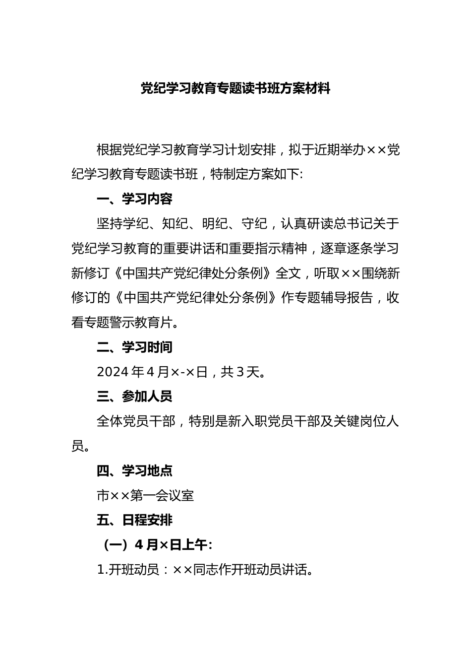 黨紀(jì)學(xué)習(xí)教育專(zhuān)題讀書(shū)班方案材料根據(jù)黨紀(jì)學(xué)習(xí)教育學(xué)習(xí)計(jì)劃安排,擬于近期舉辦××黨紀(jì)學(xué)習(xí)教育專(zhuān)題讀書(shū)班,特制定方案如下:一、學(xué)習(xí)內(nèi)容堅(jiān)持學(xué)紀(jì)、知紀(jì)、明紀(jì)、守紀(jì),認(rèn)真研讀總書(shū)記關(guān)于黨紀(jì)學(xué)習(xí)教育的重要講話(huà)和重要指示精神,逐章逐條學(xué)習(xí)新修訂《中國(guó)共產(chǎn)黨紀(jì)律處分條例》全文,聽(tīng)取××圍繞新修訂的《中國(guó)共產(chǎn)黨紀(jì)律處分條例》作專(zhuān)題輔導(dǎo)報(bào)告,收看專(zhuān)題警示教育片。二、學(xué)習(xí)時(shí)間2024年4月×-×日,共3天。三、參加人員全體黨員干部,特別是新入職黨員干部及關(guān)鍵崗位人員。四、學(xué)習(xí)地點(diǎn)市××第一會(huì)議室五、日程安排(一)4月×日上午:1.開(kāi)班動(dòng)員:××同志作開(kāi)班動(dòng)...