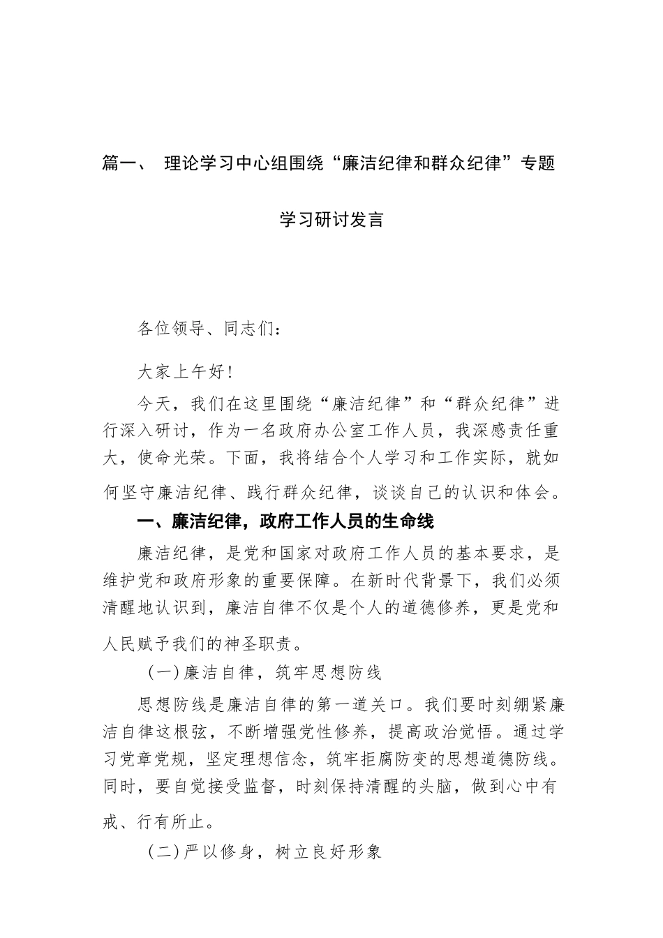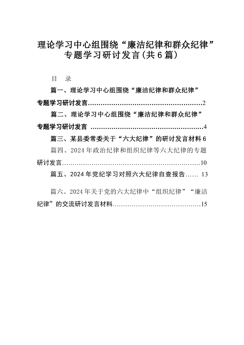 理論學(xué)習(xí)中心組圍繞“廉潔紀(jì)律和群眾紀(jì)律”專題學(xué)習(xí)研討發(fā)言(共6篇)目錄篇一、理論學(xué)習(xí)中心組圍繞“廉潔紀(jì)律和群眾紀(jì)律”專題學(xué)習(xí)研討發(fā)言………………………………………………2篇二、理論學(xué)習(xí)中心組圍繞“廉潔紀(jì)律和群眾紀(jì)律”專題學(xué)習(xí)研討發(fā)言………………………………………………4篇三、某縣委常委關(guān)于“六大紀(jì)律”的研討發(fā)言材料6篇四、2024年政治紀(jì)律和組織紀(jì)律等六大紀(jì)律的專題研討發(fā)言…………………………………………………………10篇五、2024年黨紀(jì)學(xué)習(xí)對(duì)照六大紀(jì)律自查報(bào)告……13篇六、2024年關(guān)于黨的六大紀(jì)律中“組織紀(jì)律”“廉潔紀(jì)律”的交流研討發(fā)言材料...