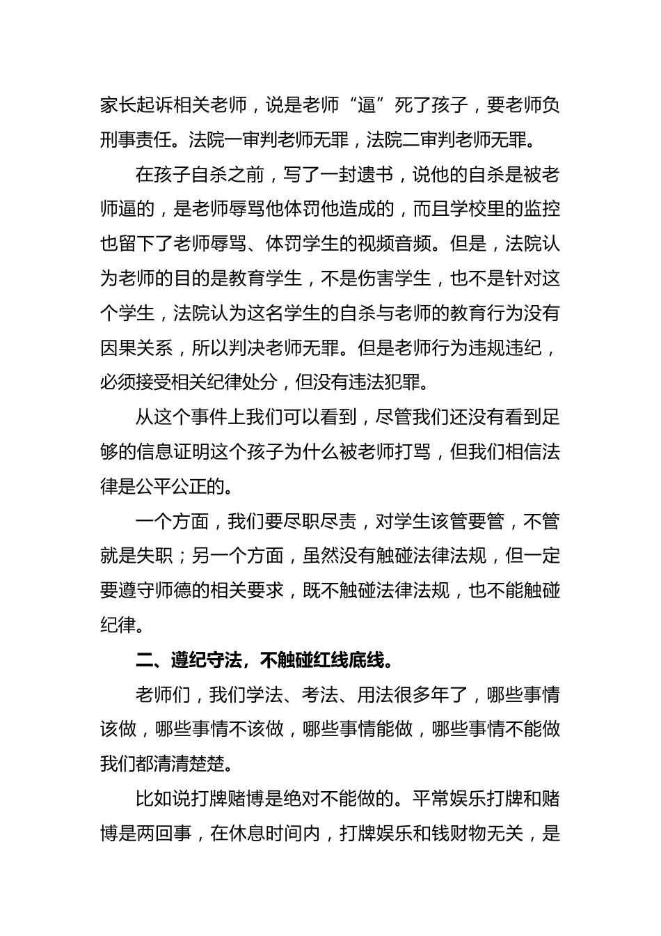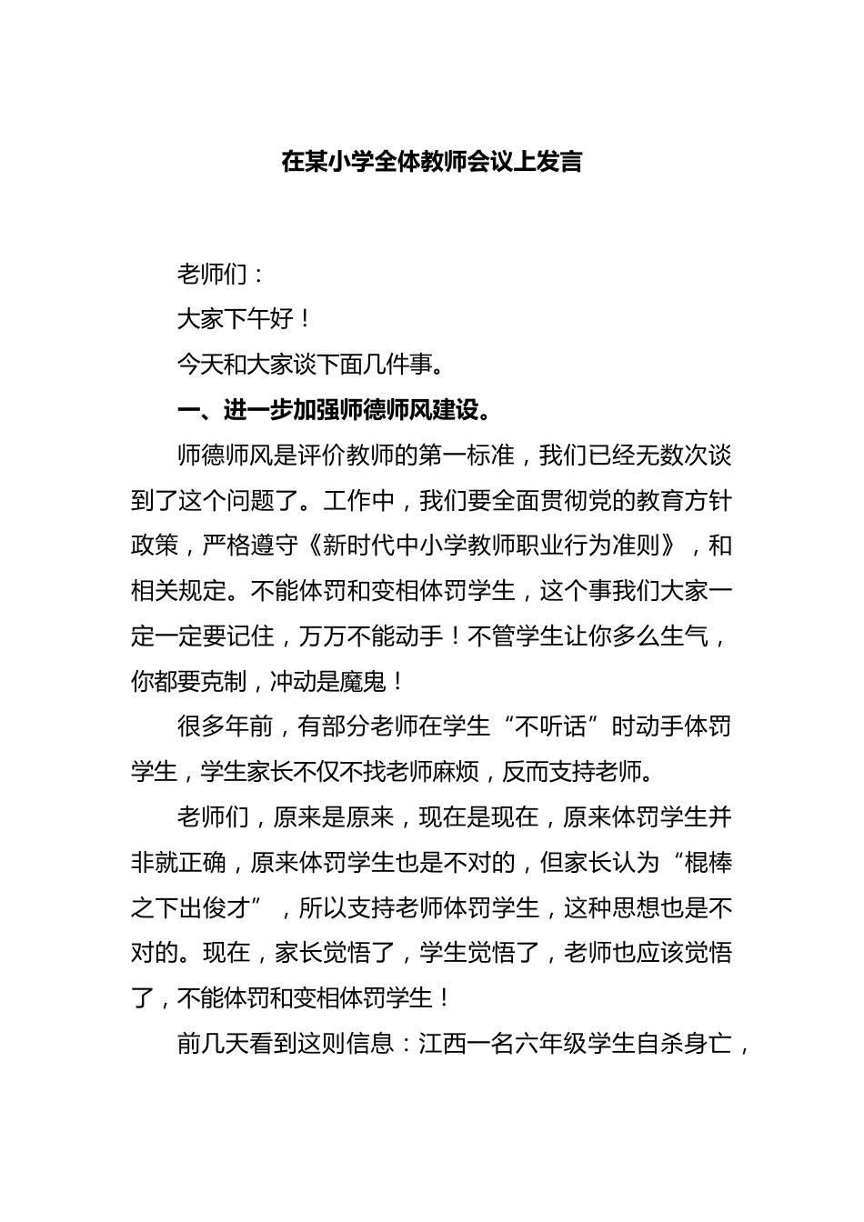 在某小學(xué)全體教師會(huì)議上發(fā)言老師們:大家下午好!今天和大家談下面幾件事。一、進(jìn)一步加強(qiáng)師德師風(fēng)建設(shè)。師德師風(fēng)是評(píng)價(jià)教師的第一標(biāo)準(zhǔn),我們已經(jīng)無數(shù)次談到了這個(gè)問題了。工作中,我們要全面貫徹黨的教育方針政策,嚴(yán)格遵守《新時(shí)代中小學(xué)教師職業(yè)行為準(zhǔn)則》,和相關(guān)規(guī)定。不能體罰和變相體罰學(xué)生,這個(gè)事我們大家一定一定要記住,萬萬不能動(dòng)手!不管學(xué)生讓你多么生氣,你都要克制,沖動(dòng)是魔鬼!很多年前,有部分老師在學(xué)生“不聽話”時(shí)動(dòng)手體罰學(xué)生,學(xué)生家長不僅不找老師麻煩,反而支持老師。老師們,原來是原來,現(xiàn)在是現(xiàn)在,原來體罰學(xué)生并非就正確,原來體罰學(xué)生也...