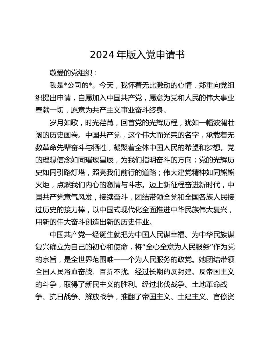 2024年版入黨申請書敬愛的黨組織:我是*公司的*。今天,我懷著無比激動的心情,鄭重向黨組織提出申請,自愿加入中國共產黨,愿意為黨和人民的偉大事業(yè)奉獻一切,愿意為共產主義事業(yè)奮斗終身。歲月如歌,時光荏苒,回首黨的光輝歷程,猶如一幅波瀾壯闊的歷史畫卷。中國共產黨,這個偉大而光榮的名字,承載著無數(shù)革命先輩奮斗與犧牲,凝聚著全體中國人民的希望和夢想。黨的理想信念如同璀璨星辰,為我們指明奮斗的方向;黨的光輝歷史如同引路燈塔,照亮我們前行的道路;偉大建黨精神如同熊熊火炬,點燃我們內心的激情與斗志。邁上新征程奮進新時代,中國共產黨意氣風發(fā),接...
