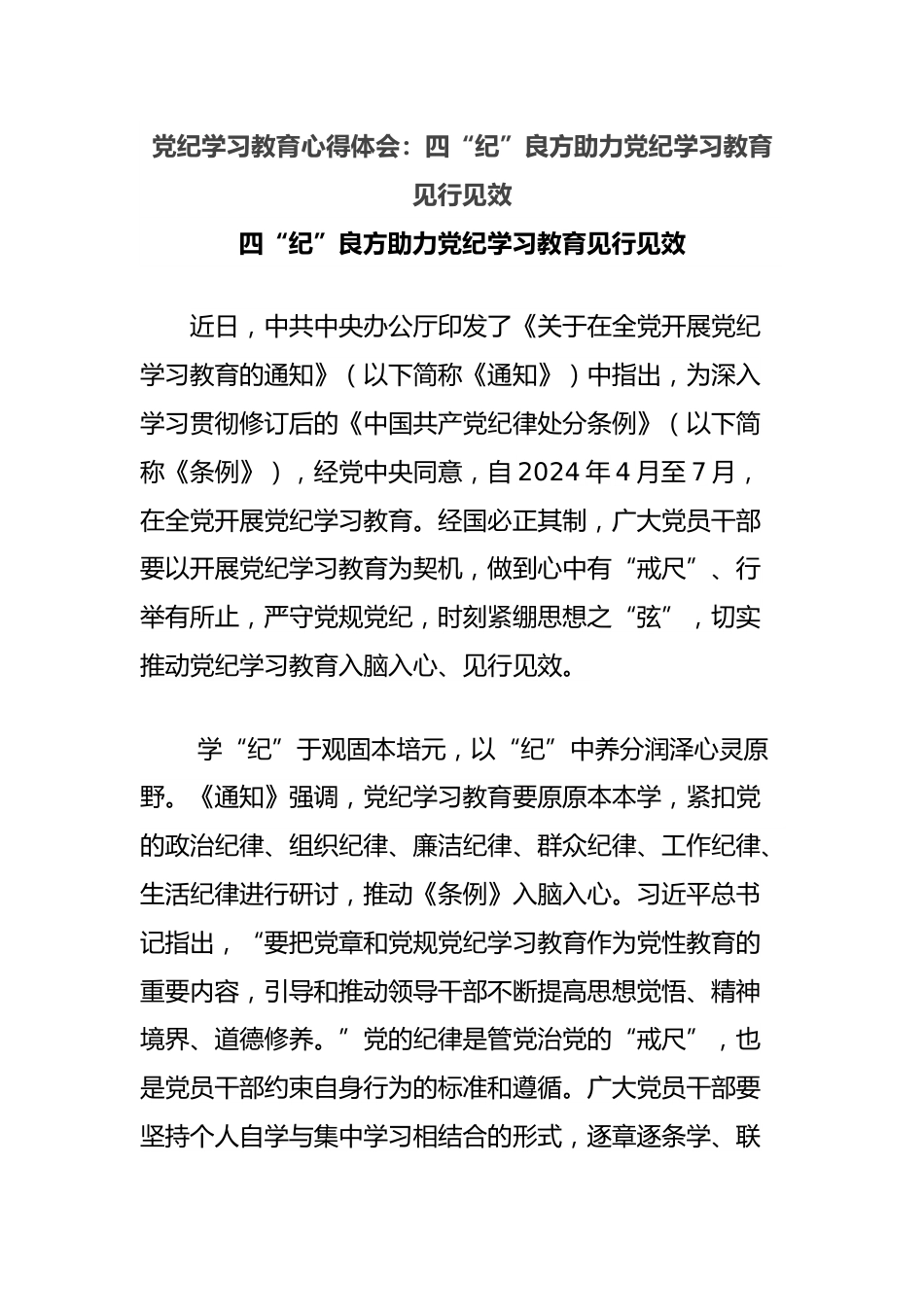 黨紀(jì)學(xué)習(xí)教育心得體會(huì):四“紀(jì)”良方助力黨紀(jì)學(xué)習(xí)教育見行見效四“紀(jì)”良方助力黨紀(jì)學(xué)習(xí)教育見行見效近日,中共中央辦公廳印發(fā)了《關(guān)于在全黨開展黨紀(jì)學(xué)習(xí)教育的通知》(以下簡(jiǎn)稱《通知》)中指出,為深入學(xué)習(xí)貫徹修訂后的《中國(guó)共產(chǎn)黨紀(jì)律處分條例》(以下簡(jiǎn)稱《條例》),經(jīng)黨中央同意,自2024年4月至7月,在全黨開展黨紀(jì)學(xué)習(xí)教育。經(jīng)國(guó)必正其制,廣大黨員干部要以開展黨紀(jì)學(xué)習(xí)教育為契機(jī),做到心中有“戒尺”、行舉有所止,嚴(yán)守黨規(guī)黨紀(jì),時(shí)刻緊繃思想之“弦”,切實(shí)推動(dòng)黨紀(jì)學(xué)習(xí)教育入腦入心、見行見效。學(xué)“紀(jì)”于觀固本培元,以“紀(jì)”中養(yǎng)分潤(rùn)澤心靈原野?!锻ㄖ?..