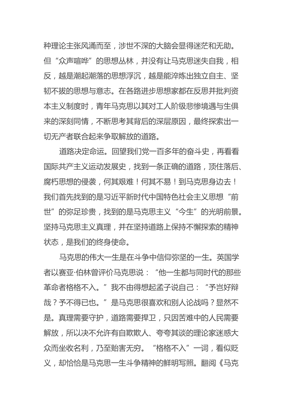 讀《馬克思的偉大一生》心得體會近日,區(qū)黨工委組織部組織開展“黨員讀書月”活動,結(jié)合近期我的讀書學(xué)習(xí),我想簡單談一下我對讀書學(xué)習(xí)的一點(diǎn)心得體會,不妥之處敬請批評指正。習(xí)近平總書記在紀(jì)念馬克思誕辰200周年大會上指出:“共產(chǎn)黨人要把讀馬克思主義經(jīng)典、悟馬克思主義原理當(dāng)作一種生活習(xí)慣、當(dāng)作一種精神追求,用經(jīng)典涵養(yǎng)正氣、淬煉思想、升華境界、指導(dǎo)實(shí)踐?!瘪R克思主義經(jīng)典永遠(yuǎn)是我們共產(chǎn)黨人的精神根脈,常讀常新。作為青年干部,要尋根溯源,多閱讀一些馬克思主義經(jīng)典。同時,要深刻認(rèn)識馬克思主義的真理力量,到馬克思身邊去,和偉人一起成長、思考、磨礪...
