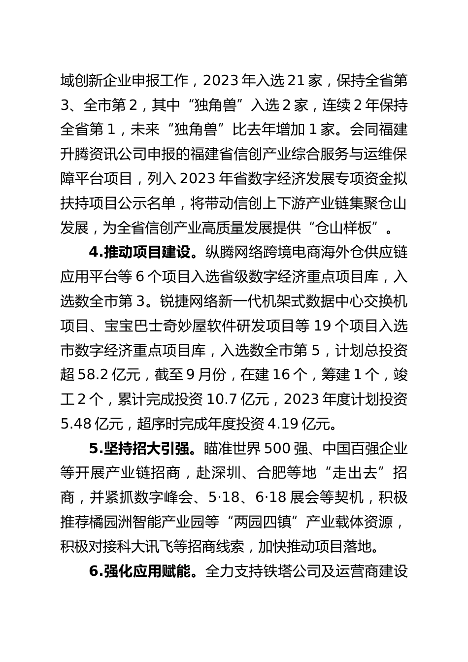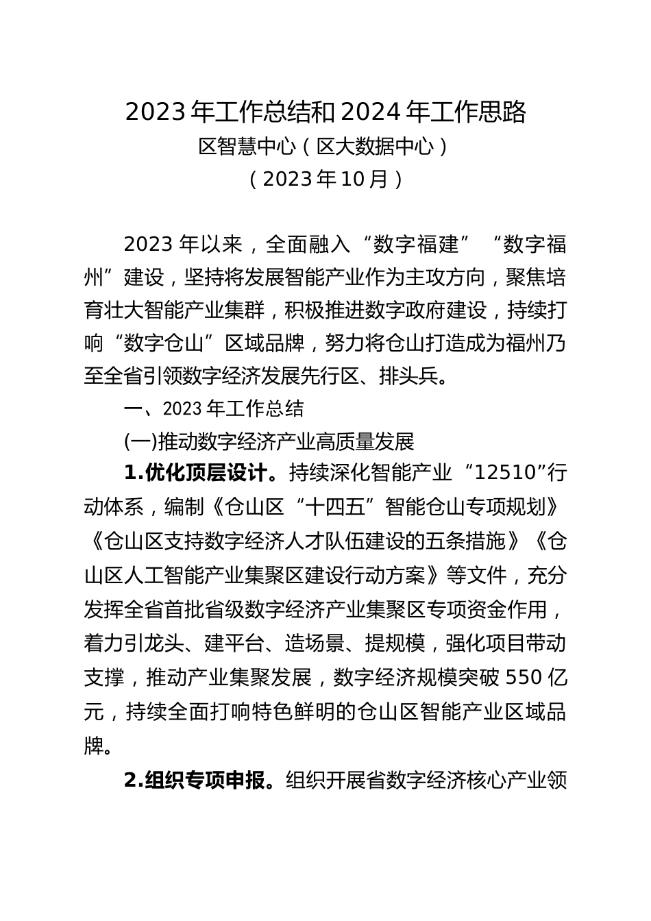 2023年工作總結(jié)和2024年工作思路區(qū)智慧中心(區(qū)大數(shù)據(jù)中心)(2023年10月)2023年以來(lái),全面融入“數(shù)字福建”“數(shù)字福州”建設(shè),堅(jiān)持將發(fā)展智能產(chǎn)業(yè)作為主攻方向,聚焦培育壯大智能產(chǎn)業(yè)集群,積極推進(jìn)數(shù)字政府建設(shè),持續(xù)打響“數(shù)字倉(cāng)山”區(qū)域品牌,努力將倉(cāng)山打造成為福州乃至全省引領(lǐng)數(shù)字經(jīng)濟(jì)發(fā)展先行區(qū)、排頭兵。一、2023年工作總結(jié)(一)推動(dòng)數(shù)字經(jīng)濟(jì)產(chǎn)業(yè)高質(zhì)量發(fā)展1.優(yōu)化頂層設(shè)計(jì)。持續(xù)深化智能產(chǎn)業(yè)“12510”行動(dòng)體系,編制《倉(cāng)山區(qū)“十四五”智能倉(cāng)山專項(xiàng)規(guī)劃》《倉(cāng)山區(qū)支持?jǐn)?shù)字經(jīng)濟(jì)人才隊(duì)伍建設(shè)的五條措施》《倉(cāng)山區(qū)人工智能產(chǎn)業(yè)集聚區(qū)建設(shè)行動(dòng)方案》等文件,充分發(fā)...