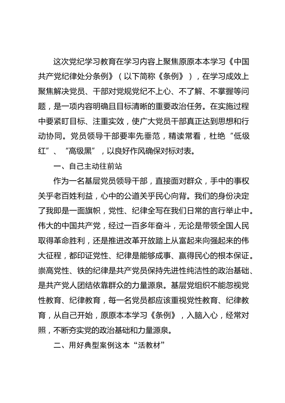 這次黨紀(jì)學(xué)習(xí)教育在學(xué)習(xí)內(nèi)容上聚焦原原本本學(xué)習(xí)《中國(guó)共產(chǎn)黨紀(jì)律處分條例》(以下簡(jiǎn)稱《條例》),在學(xué)習(xí)成效上聚焦解決黨員、干部對(duì)黨規(guī)黨紀(jì)不上心、不了解、不掌握等問(wèn)題,是一項(xiàng)內(nèi)容明確且目標(biāo)清晰的重要政治任務(wù)。在實(shí)施過(guò)程中要緊盯目標(biāo)、注重實(shí)效,使廣大黨員干部真正達(dá)到思想和行動(dòng)協(xié)同。黨員領(lǐng)導(dǎo)干部要率先垂范,精讀??矗沤^“低級(jí)紅”、“高級(jí)黑”,以良好作風(fēng)確保對(duì)標(biāo)對(duì)表。一、自己主動(dòng)往前站作為一名基層黨員領(lǐng)導(dǎo)干部,直接面對(duì)群眾,手中的事權(quán)關(guān)乎老百姓利益,心中的公道關(guān)乎民心向背。我們的身份決定了我即是一面旗幟,黨性、紀(jì)律全寫在我們?nèi)粘5难孕?..