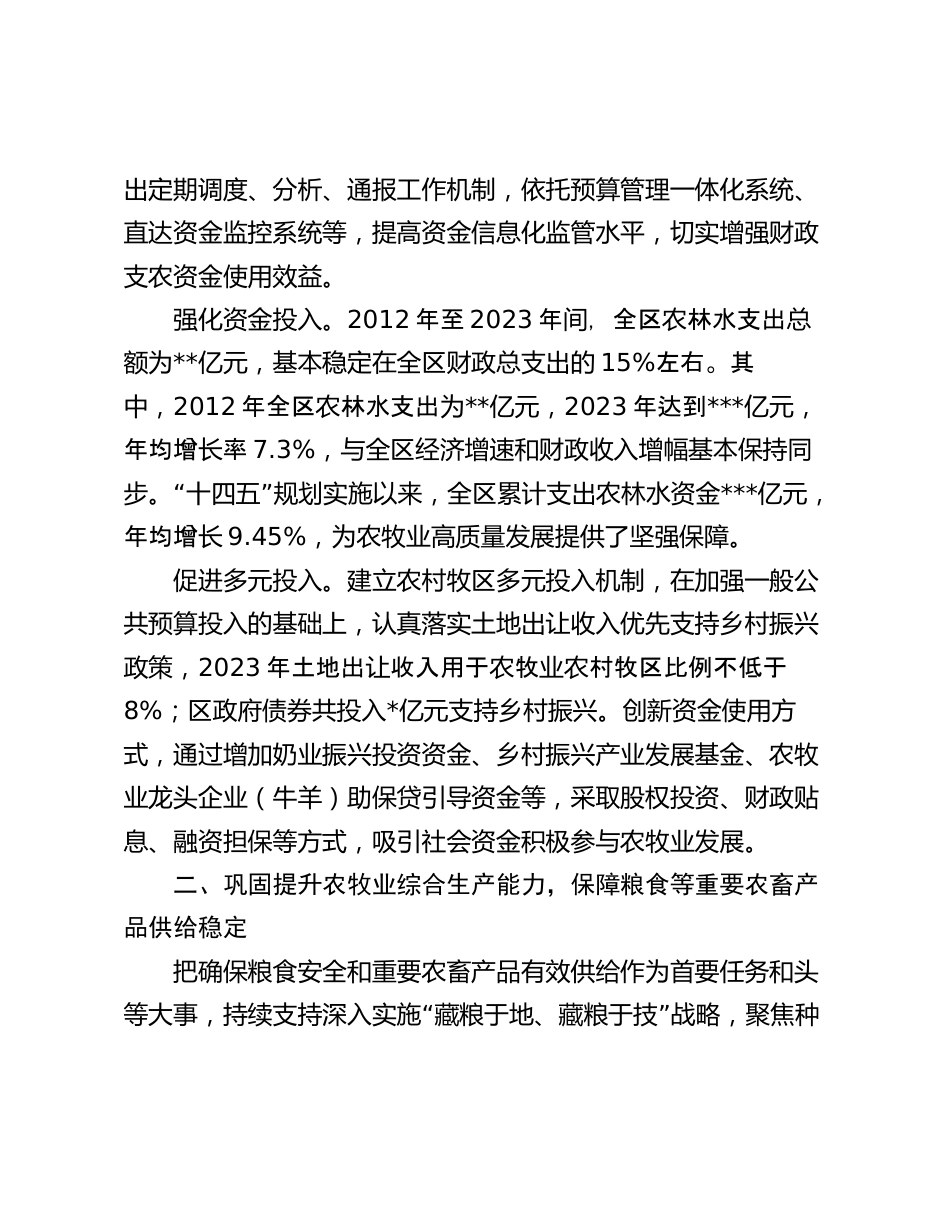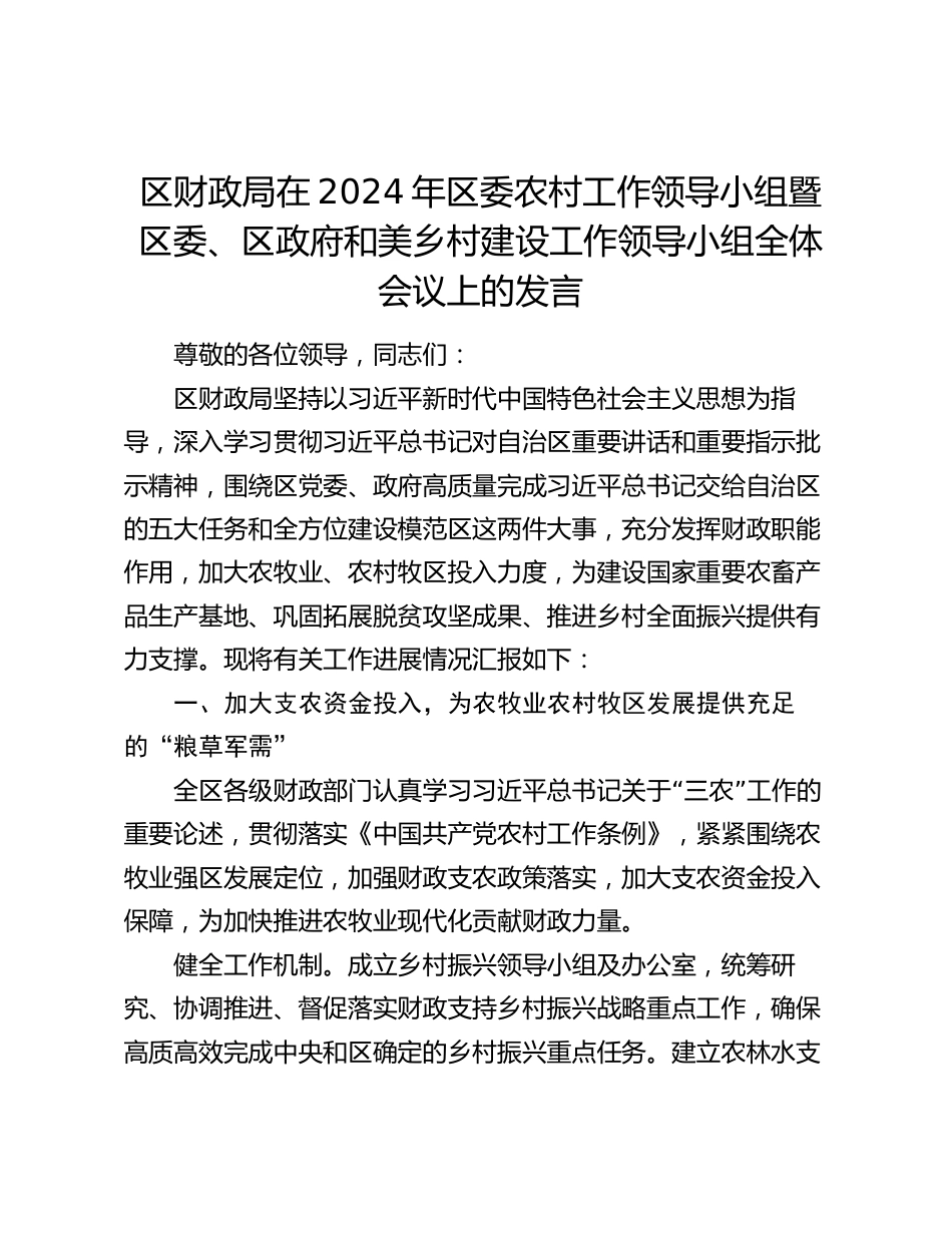 區(qū)財(cái)政局在2024年區(qū)委農(nóng)村工作領(lǐng)導(dǎo)小組暨區(qū)委、區(qū)政府和美鄉(xiāng)村建設(shè)工作領(lǐng)導(dǎo)小組全體會(huì)議上的發(fā)言尊敬的各位領(lǐng)導(dǎo),同志們:區(qū)財(cái)政局堅(jiān)持以習(xí)近平新時(shí)代中國(guó)特色社會(huì)主義思想為指導(dǎo),深入學(xué)習(xí)貫徹習(xí)近平總書(shū)記對(duì)自治區(qū)重要講話(huà)和重要指示批示精神,圍繞區(qū)黨委、政府高質(zhì)量完成習(xí)近平總書(shū)記交給自治區(qū)的五大任務(wù)和全方位建設(shè)模范區(qū)這兩件大事,充分發(fā)揮財(cái)政職能作用,加大農(nóng)牧業(yè)、農(nóng)村牧區(qū)投入力度,為建設(shè)國(guó)家重要農(nóng)畜產(chǎn)品生產(chǎn)基地、鞏固拓展脫貧攻堅(jiān)成果、推進(jìn)鄉(xiāng)村全面振興提供有力支撐?,F(xiàn)將有關(guān)工作進(jìn)展情況匯報(bào)如下:一、加大支農(nóng)資金投入,為農(nóng)牧業(yè)農(nóng)村牧區(qū)發(fā)展提供充...