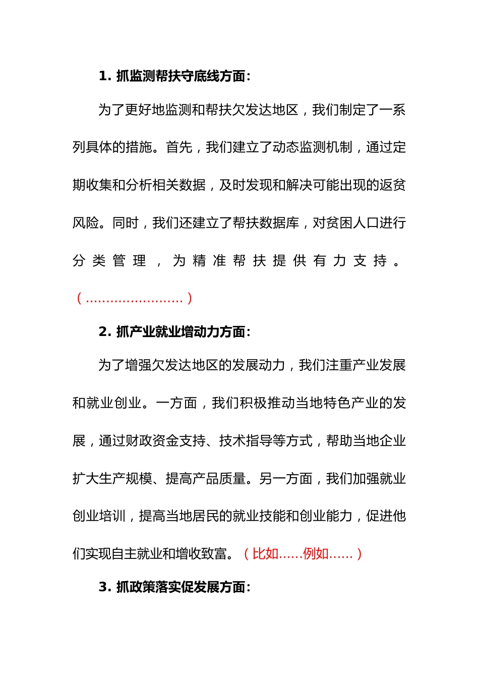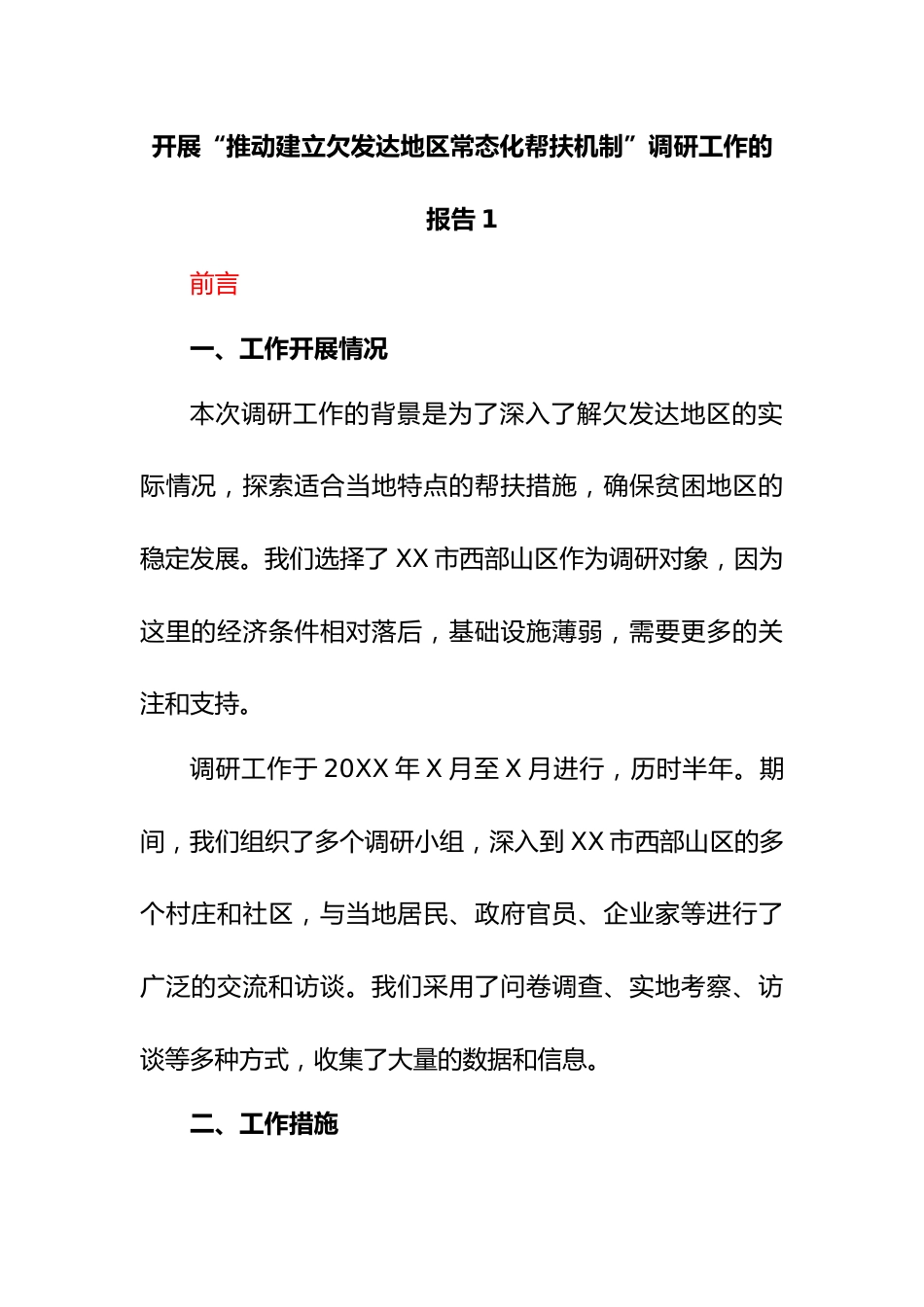 開展“推動(dòng)建立欠發(fā)達(dá)地區(qū)常態(tài)化幫扶機(jī)制”調(diào)研工作的報(bào)告1前言一、工作開展情況本次調(diào)研工作的背景是為了深入了解欠發(fā)達(dá)地區(qū)的實(shí)際情況,探索適合當(dāng)?shù)靥攸c(diǎn)的幫扶措施,確保貧困地區(qū)的穩(wěn)定發(fā)展。我們選擇了XX市西部山區(qū)作為調(diào)研對象,因?yàn)檫@里的經(jīng)濟(jì)條件相對落后,基礎(chǔ)設(shè)施薄弱,需要更多的關(guān)注和支持。調(diào)研工作于20XX年X月至X月進(jìn)行,歷時(shí)半年。期間,我們組織了多個(gè)調(diào)研小組,深入到XX市西部山區(qū)的多個(gè)村莊和社區(qū),與當(dāng)?shù)鼐用?、政府官員、企業(yè)家等進(jìn)行了廣泛的交流和訪談。我們采用了問卷調(diào)查、實(shí)地考察、訪談等多種方式,收集了大量的數(shù)據(jù)和信息。二、工作措施1.抓監(jiān)...