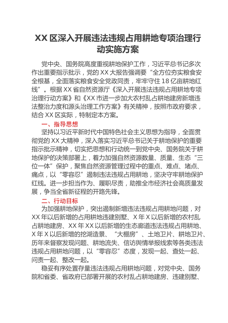 XX區(qū)深入開(kāi)展違法違規(guī)占用耕地專(zhuān)項(xiàng)治理行動(dòng)實(shí)施方案黨中央、國(guó)務(wù)院高度重視耕地保護(hù)工作,習(xí)近平總書(shū)記多次作出重要指示批示,黨的XX大報(bào)告強(qiáng)調(diào)要“全方位夯實(shí)糧食安全根基,全面落實(shí)糧食安全黨政同責(zé),牢牢守住18億畝耕地紅線(xiàn)”。根據(jù)XX省自然資源廳《深入開(kāi)展違法違規(guī)占用耕地專(zhuān)項(xiàng)治理行動(dòng)方案》和《XX市進(jìn)一步加大農(nóng)村亂占耕地建房新增違法整治力度和源頭治理工作方案》有關(guān)精神,按照市政府要求,結(jié)合XX區(qū)實(shí)際,特制定本方案。一、指導(dǎo)思想堅(jiān)持以習(xí)近平新時(shí)代中國(guó)特色社會(huì)主義思想為指導(dǎo),全面貫徹黨的XX大精神,深入落實(shí)習(xí)近平總書(shū)記關(guān)于耕地保護(hù)的重要指示批示精神...