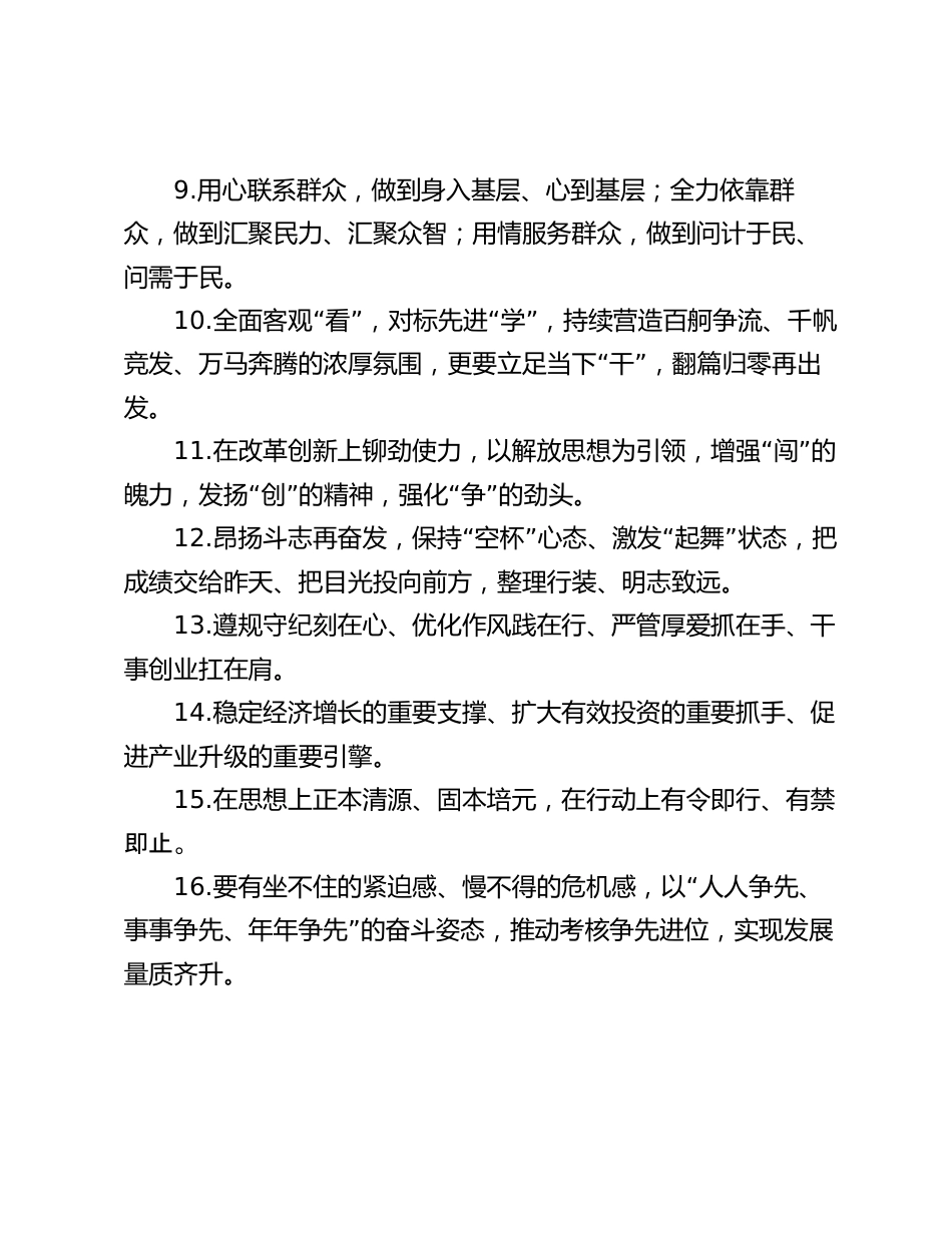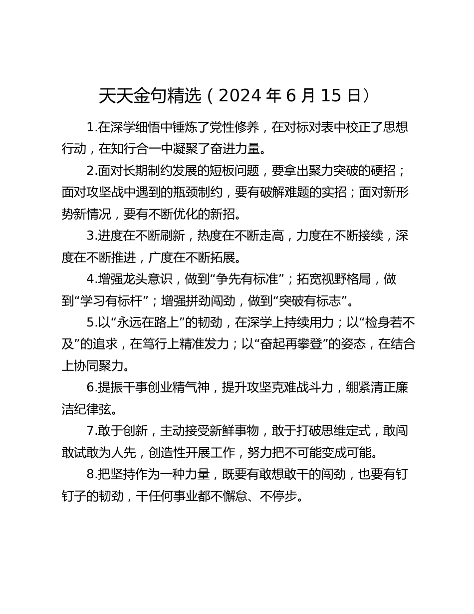 天天金句精選(2024年6月15日)1.在深學(xué)細(xì)悟中錘煉了黨性修養(yǎng),在對標(biāo)對表中校正了思想行動,在知行合一中凝聚了奮進(jìn)力量。2.面對長期制約發(fā)展的短板問題,要拿出聚力突破的硬招;面對攻堅戰(zhàn)中遇到的瓶頸制約,要有破解難題的實招;面對新形勢新情況,要有不斷優(yōu)化的新招。3.進(jìn)度在不斷刷新,熱度在不斷走高,力度在不斷接續(xù),深度在不斷推進(jìn),廣度在不斷拓展。4.“”增強龍頭意識,做到爭先有標(biāo)準(zhǔn);拓寬視野格局,做“”“”到學(xué)習(xí)有標(biāo)桿;增強拼勁闖勁,做到突破有標(biāo)志。5.“”“以永遠(yuǎn)在路上的韌勁,在深學(xué)上持續(xù)用力;以檢身若不”“”及的追求,在篤行上精準(zhǔn)發(fā)力;...