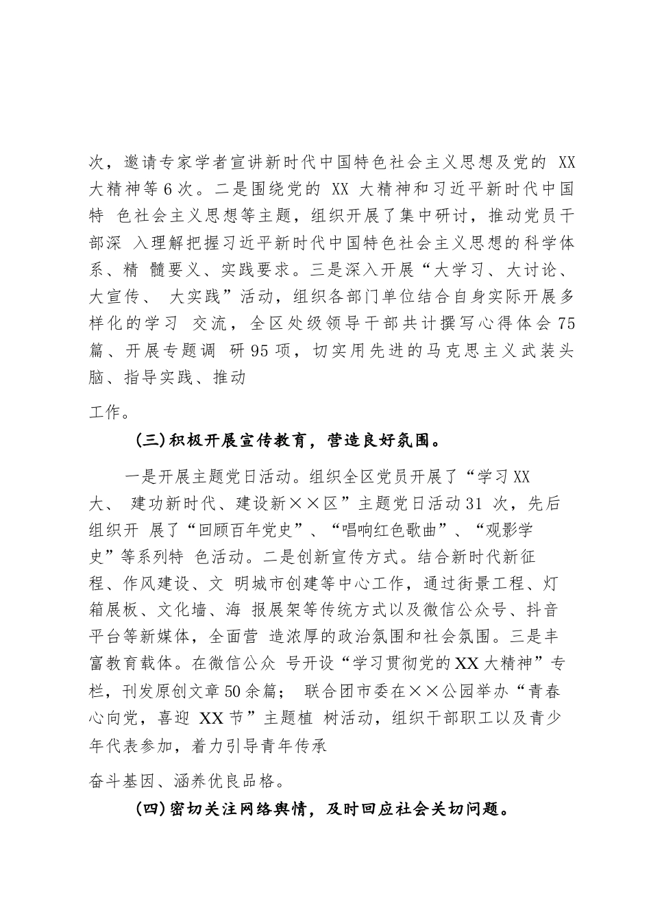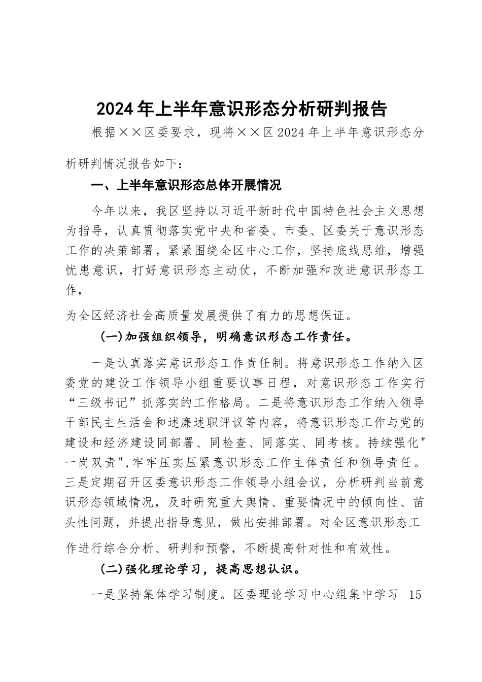 2024年上半年意識(shí)形態(tài)分析研判報(bào)告根據(jù)××區(qū)委要求,現(xiàn)將××區(qū)2024年上半年意識(shí)形態(tài)分析研判情況報(bào)告如下:一、上半年意識(shí)形態(tài)總體開展情況今年以來,我區(qū)堅(jiān)持以習(xí)近平新時(shí)代中國特色社會(huì)主義思想為指導(dǎo),認(rèn)真貫徹落實(shí)黨中央和省委、市委、區(qū)委關(guān)于意識(shí)形態(tài)工作的決策部署,緊緊圍繞全區(qū)中心工作,堅(jiān)持底線思維,增強(qiáng)憂患意識(shí),打好意識(shí)形態(tài)主動(dòng)仗,不斷加強(qiáng)和改進(jìn)意識(shí)形態(tài)工作,為全區(qū)經(jīng)濟(jì)社會(huì)高質(zhì)量發(fā)展提供了有力的思想保證。(一)加強(qiáng)組織領(lǐng)導(dǎo),明確意識(shí)形態(tài)工作責(zé)任。一是認(rèn)真落實(shí)意識(shí)形態(tài)工作責(zé)任制。將意識(shí)形態(tài)工作納入?yún)^(qū)委黨的建設(shè)工作領(lǐng)導(dǎo)小組重要議事日程,對(duì)...