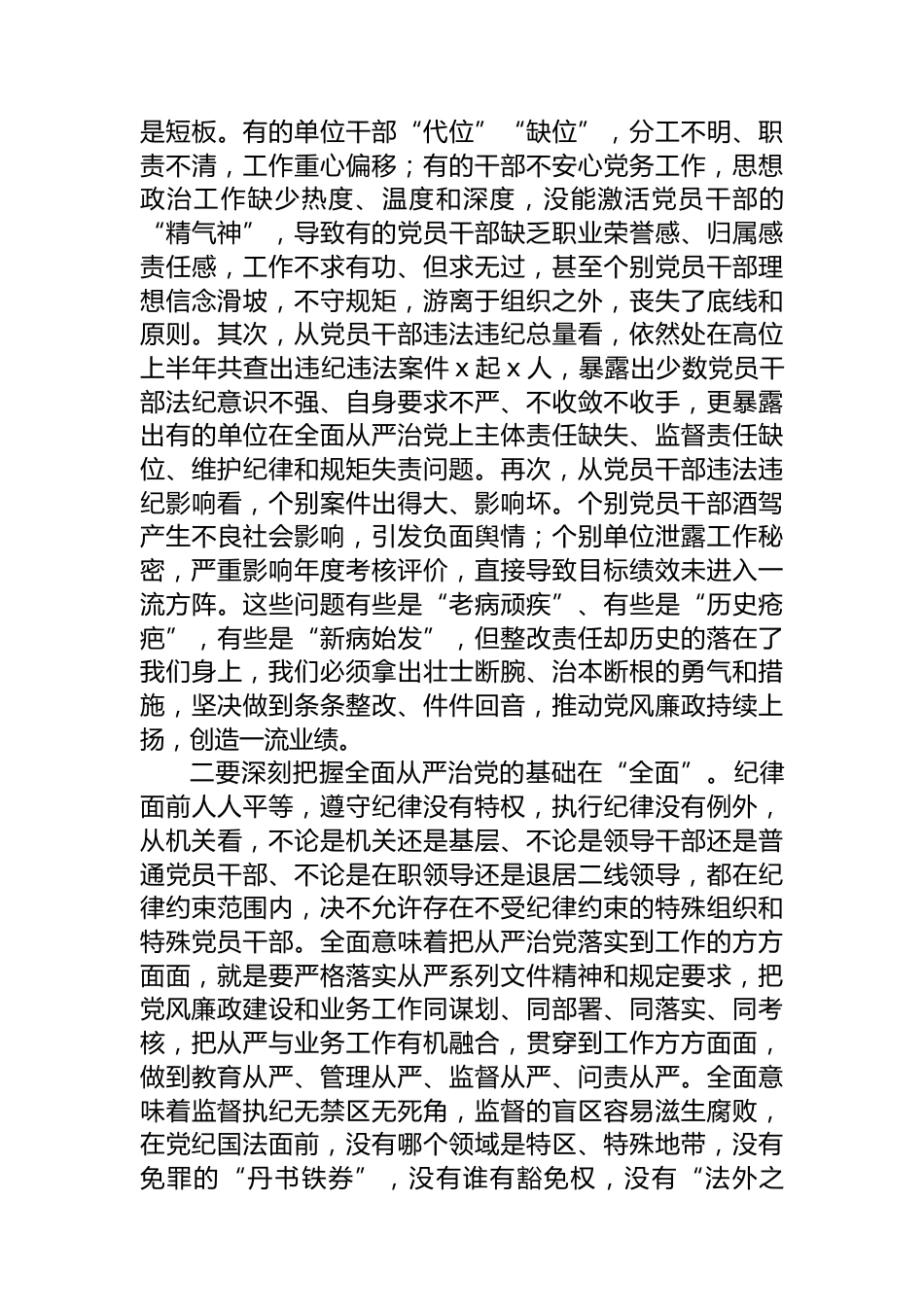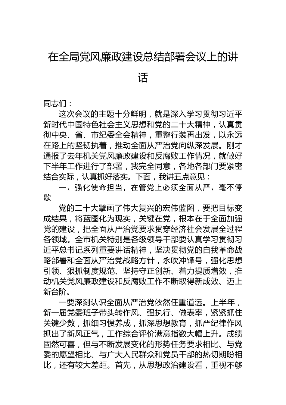 在全局黨風(fēng)廉政建設(shè)總結(jié)部署會議上的講話同志們:這次會議的主題十分鮮明,就是深入學(xué)習(xí)貫徹習(xí)近平新時代中國特色社會主義思想和黨的二十大精神,認真貫徹中央、省、市紀委全會精神,重整行裝再出發(fā),以永遠在路上的堅韌執(zhí)著,推動全面從嚴治黨向縱深發(fā)展。剛才通報了去年機關(guān)黨風(fēng)廉政建設(shè)和反腐敗工作情況,就做好下半年工作進行了部署,我完全同意,各地各部門要緊密結(jié)合實際,認真抓好落實。下面,我講五點意見:一、強化使命擔(dān)當,在管黨上必須全面從嚴、毫不停歇黨的二十大擘畫了偉大復(fù)興的宏偉藍圖,要把目標變成結(jié)果,將藍圖化為現(xiàn)實,關(guān)鍵在黨,根本在于全面加強...