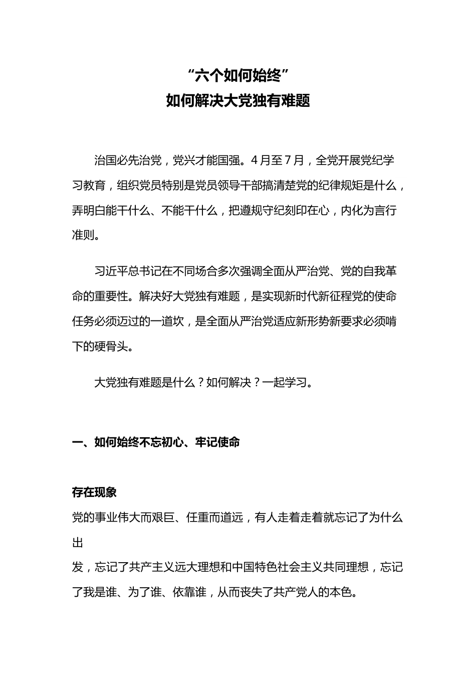 “六個(gè)如何始終”如何解決大黨獨(dú)有難題治國(guó)必先治黨,黨興才能?chē)?guó)強(qiáng)。4月至7月,全黨開(kāi)展黨紀(jì)學(xué)習(xí)教育,組織黨員特別是黨員領(lǐng)導(dǎo)干部搞清楚黨的紀(jì)律規(guī)矩是什么,弄明白能干什么、不能干什么,把遵規(guī)守紀(jì)刻印在心,內(nèi)化為言行準(zhǔn)則。習(xí)近平總書(shū)記在不同場(chǎng)合多次強(qiáng)調(diào)全面從嚴(yán)治黨、黨的自我革命的重要性。解決好大黨獨(dú)有難題,是實(shí)現(xiàn)新時(shí)代新征程黨的使命任務(wù)必須邁過(guò)的一道坎,是全面從嚴(yán)治黨適應(yīng)新形勢(shì)新要求必須啃下的硬骨頭。大黨獨(dú)有難題是什么?如何解決?一起學(xué)習(xí)。一、如何始終不忘初心、牢記使命存在現(xiàn)象黨的事業(yè)偉大而艱巨、任重而道遠(yuǎn),有人走著走著就忘記了為什么...
