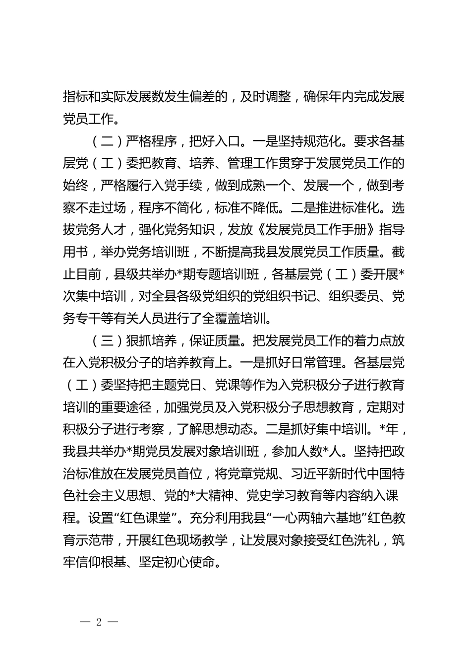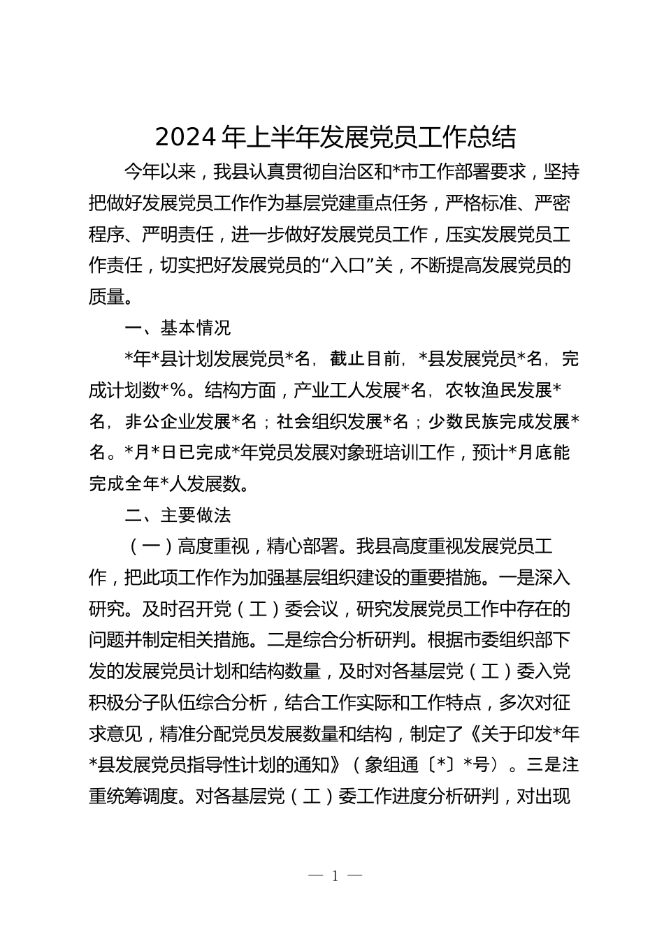 2024年上半年發(fā)展黨員工作總結(jié)今年以來(lái),我縣認(rèn)真貫徹自治區(qū)和*市工作部署要求,堅(jiān)持把做好發(fā)展黨員工作作為基層黨建重點(diǎn)任務(wù),嚴(yán)格標(biāo)準(zhǔn)、嚴(yán)密程序、嚴(yán)明責(zé)任,進(jìn)一步做好發(fā)展黨員工作,壓實(shí)發(fā)展黨員工“”作責(zé)任,切實(shí)把好發(fā)展黨員的入口關(guān),不斷提高發(fā)展黨員的質(zhì)量。一、基本情況*年*縣計(jì)劃發(fā)展黨員*名,截止目前,*縣發(fā)展黨員*名,完成計(jì)劃數(shù)*%。結(jié)構(gòu)方面,產(chǎn)業(yè)工人發(fā)展*名,牧民展農(nóng)漁發(fā)*名,非公企業(yè)發(fā)展*名;社會(huì)組織發(fā)展*名;少數(shù)民族完成發(fā)展*名。*月*日已完成*年黨員發(fā)展對(duì)象班培訓(xùn)工作,預(yù)計(jì)*月底能完成全年*人發(fā)展數(shù)。二、主要做法(一)高度重視,精心部署...