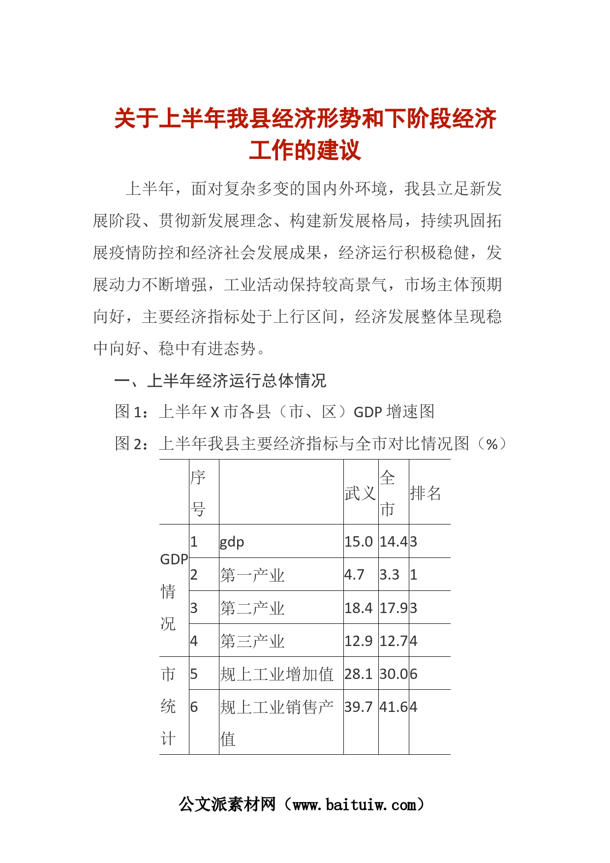 關(guān)于上半年我縣經(jīng)濟形勢和下階段經(jīng)濟工作的建議上半年,面對復雜多變的國內(nèi)外環(huán)境,我縣立足新發(fā)展階段、貫徹新發(fā)展理念、構(gòu)建新發(fā)展格局,持續(xù)鞏固拓展疫情防控和經(jīng)濟社會發(fā)展成果,經(jīng)濟運行積極穩(wěn)健,發(fā)展動力不斷增強,工業(yè)活動保持較高景氣,市場主體預期向好,主要經(jīng)濟指標處于上行區(qū)間,經(jīng)濟發(fā)展整體呈現(xiàn)穩(wěn)中向好、穩(wěn)中有進態(tài)勢。一、上半年經(jīng)濟運行總體情況圖1:上半年X市各縣(市、區(qū))GDP增速圖圖2:上半年我縣主要經(jīng)濟指標與全市對比情況圖(%)序全武義排名號市1gdp15.014.43GDP第一產(chǎn)業(yè)4.73.31第二產(chǎn)業(yè)18.417.932第三產(chǎn)業(yè)12.912.74情3況4市5規(guī)上工業(yè)增加值28...
