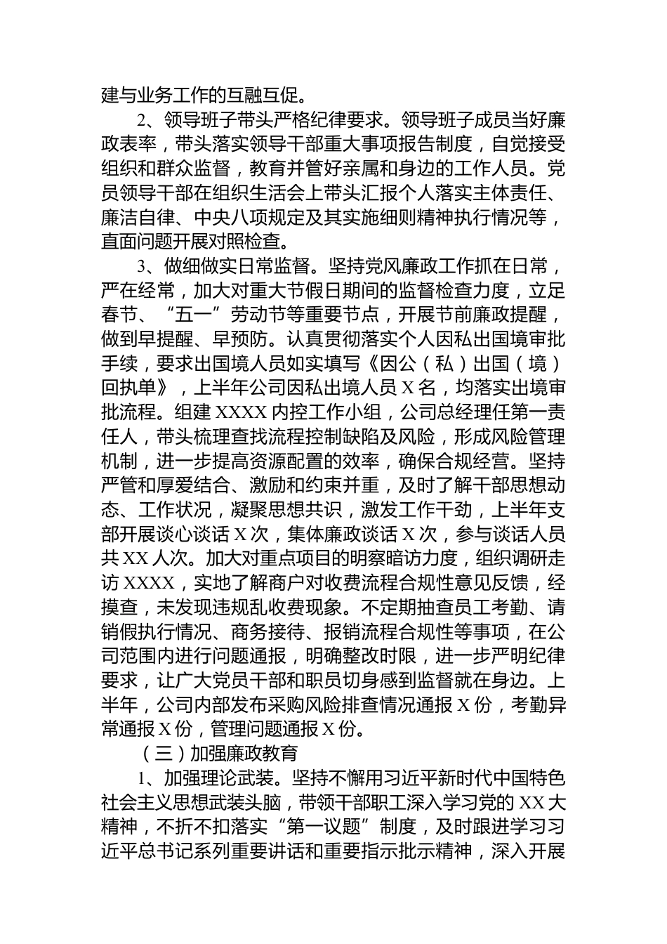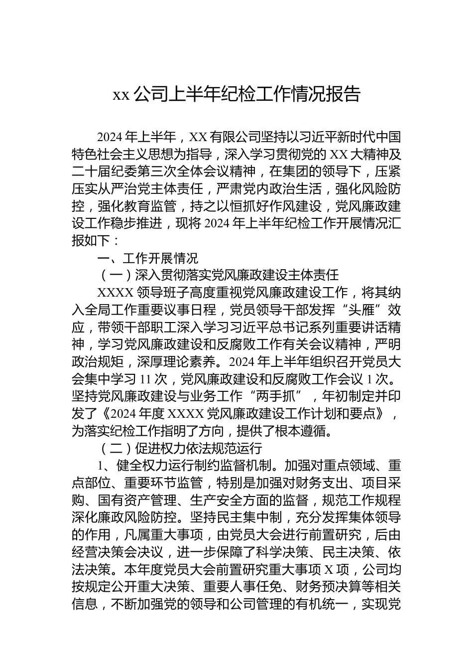 xx公司上半年紀(jì)檢工作情況報(bào)告2024年上半年,XX有限公司堅(jiān)持以習(xí)近平新時(shí)代中國(guó)特色社會(huì)主義思想為指導(dǎo),深入學(xué)習(xí)貫徹黨的XX大精神及二十屆紀(jì)委第三次全體會(huì)議精神,在集團(tuán)的領(lǐng)導(dǎo)下,壓緊壓實(shí)從嚴(yán)治黨主體責(zé)任,嚴(yán)肅黨內(nèi)政治生活,強(qiáng)化風(fēng)險(xiǎn)防控,強(qiáng)化教育監(jiān)管,持之以恒抓好作風(fēng)建設(shè),黨風(fēng)廉政建設(shè)工作穩(wěn)步推進(jìn),現(xiàn)將2024年上半年紀(jì)檢工作開(kāi)展情況匯報(bào)如下:一、工作開(kāi)展情況(一)深入貫徹落實(shí)黨風(fēng)廉政建設(shè)主體責(zé)任XXXX領(lǐng)導(dǎo)班子高度重視黨風(fēng)廉政建設(shè)工作,將其納入全局工作重要議事日程,黨員領(lǐng)導(dǎo)干部發(fā)揮“頭雁”效應(yīng),帶領(lǐng)干部職工深入學(xué)習(xí)習(xí)近平總書(shū)記系列重要講話(huà)精...