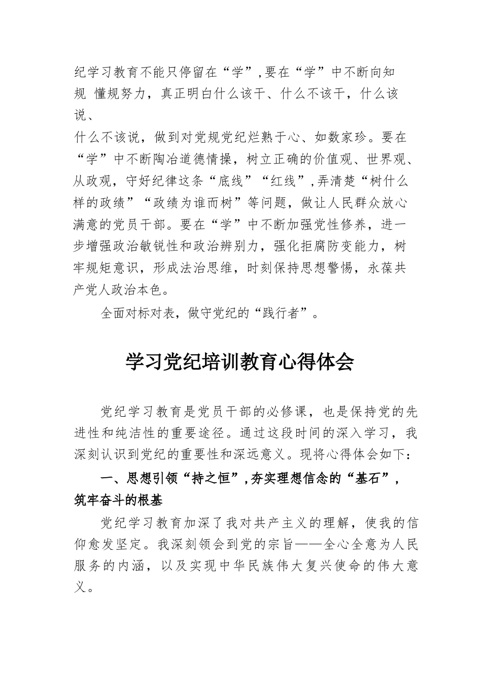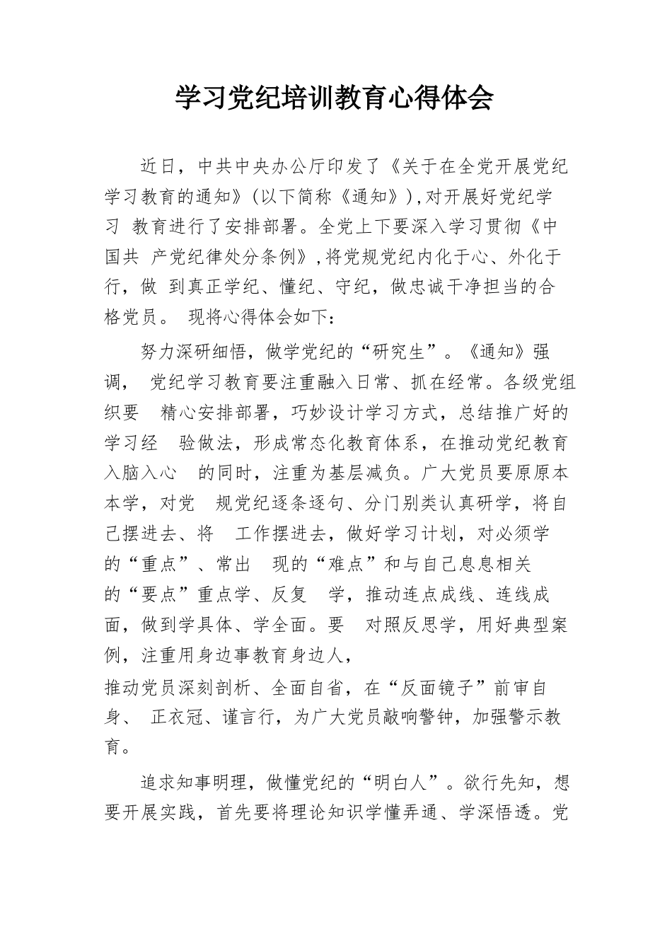 學(xué)習(xí)黨紀(jì)培訓(xùn)教育心得體會(huì)近日,中共中央辦公廳印發(fā)了《關(guān)于在全黨開(kāi)展黨紀(jì)學(xué)習(xí)教育的通知》(以下簡(jiǎn)稱《通知》),對(duì)開(kāi)展好黨紀(jì)學(xué)習(xí)教育進(jìn)行了安排部署。全黨上下要深入學(xué)習(xí)貫徹《中國(guó)共產(chǎn)黨紀(jì)律處分條例》,將黨規(guī)黨紀(jì)內(nèi)化于心、外化于行,做到真正學(xué)紀(jì)、懂紀(jì)、守紀(jì),做忠誠(chéng)干凈擔(dān)當(dāng)?shù)暮细顸h員?,F(xiàn)將心得體會(huì)如下:努力深研細(xì)悟,做學(xué)黨紀(jì)的“研究生”?!锻ㄖ窂?qiáng)調(diào),黨紀(jì)學(xué)習(xí)教育要注重融入日常、抓在經(jīng)常。各級(jí)黨組織要精心安排部署,巧妙設(shè)計(jì)學(xué)習(xí)方式,總結(jié)推廣好的學(xué)習(xí)經(jīng)驗(yàn)做法,形成常態(tài)化教育體系,在推動(dòng)黨紀(jì)教育入腦入心的同時(shí),注重為基層減負(fù)。廣大黨員要原原本...