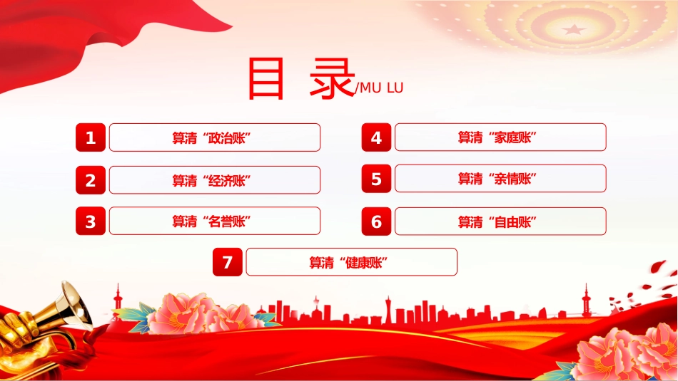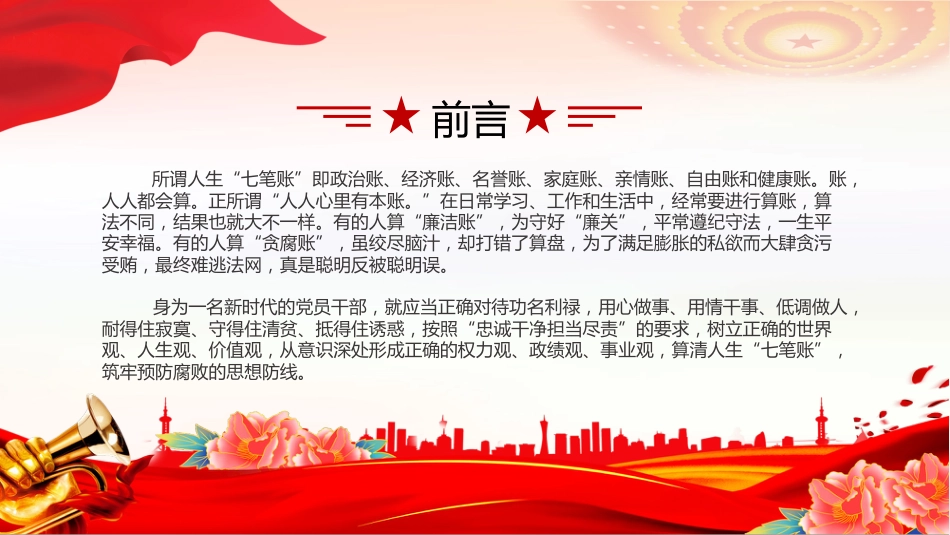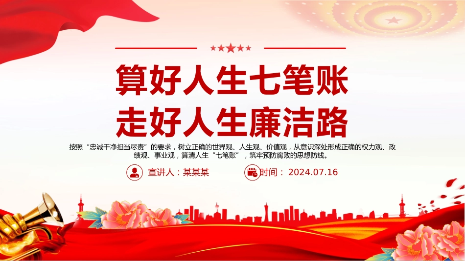 宣講人:某某某時(shí)間:2024.07.16算好人生七筆賬走好人生廉潔路按照“忠誠干凈擔(dān)當(dāng)盡責(zé)”的要求,樹立正確的世界觀、人生觀、價(jià)值觀,從意識(shí)深處形成正確的權(quán)力觀、政績觀、事業(yè)觀,算清人生“七筆賬”,筑牢預(yù)防腐敗的思想防線。前言所謂人生“七筆賬”即政治賬、經(jīng)濟(jì)賬、名譽(yù)賬、家庭賬、親情賬、自由賬和健康賬。賬,人人都會(huì)算。正所謂“人人心里有本賬。”在日常學(xué)習(xí)、工作和生活中,經(jīng)常要進(jìn)行算賬,算法不同,結(jié)果也就大不一樣。有的人算“廉潔賬”,為守好“廉關(guān)”,平常遵紀(jì)守法,一生平安幸福。有的人算“貪腐賬”,雖絞盡腦汁,卻打錯(cuò)了算盤,為了滿足膨脹的私...