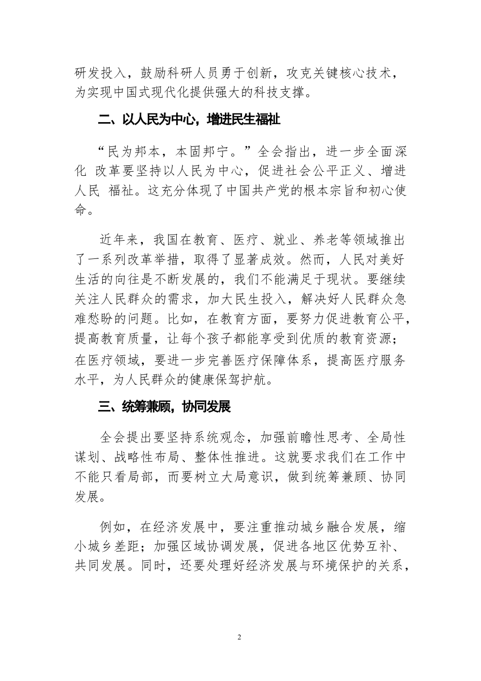 (10篇)2024年二十屆三中全會的交流發(fā)言稿交流研討材料第一篇,共十篇—深化改革,推進(jìn)中國式現(xiàn)代化黨的二十屆三中全會是在以中國式現(xiàn)代化全面推進(jìn)強(qiáng)國建設(shè)、民族復(fù)興偉業(yè)的關(guān)鍵時(shí)期召開的一次十分重要的會議。全會深入分析了推進(jìn)中國式現(xiàn)代化面臨的新情況新問題,科學(xué)謀劃了圍繞推進(jìn)中國式現(xiàn)代化進(jìn)一步全面深化改革的總體部署,為我們在新征程上推動(dòng)各項(xiàng)事業(yè)發(fā)展指明了方向。通過對全會精神的學(xué)習(xí),我深受啟發(fā),以下是我的一些心得體會。一、改革創(chuàng)新,與時(shí)俱進(jìn)全會強(qiáng)調(diào)了進(jìn)一步全面深化改革的重要性,“茍日新,日日新,又日新”,在新時(shí)代的浪潮中,只有不斷改革創(chuàng)新,...