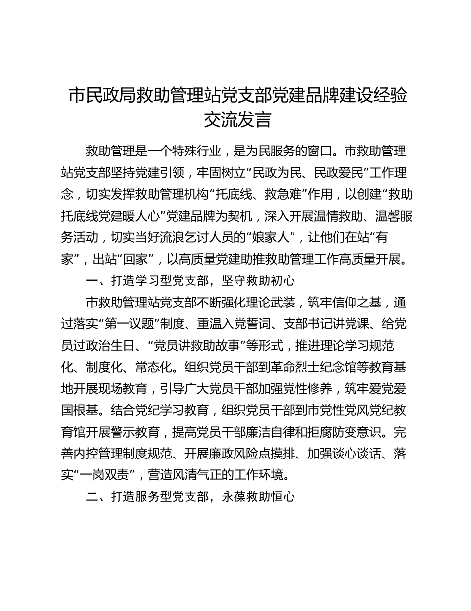 市民政局救助管理站黨支部黨建品牌建設(shè)經(jīng)驗(yàn)交流發(fā)言VIP免費(fèi)