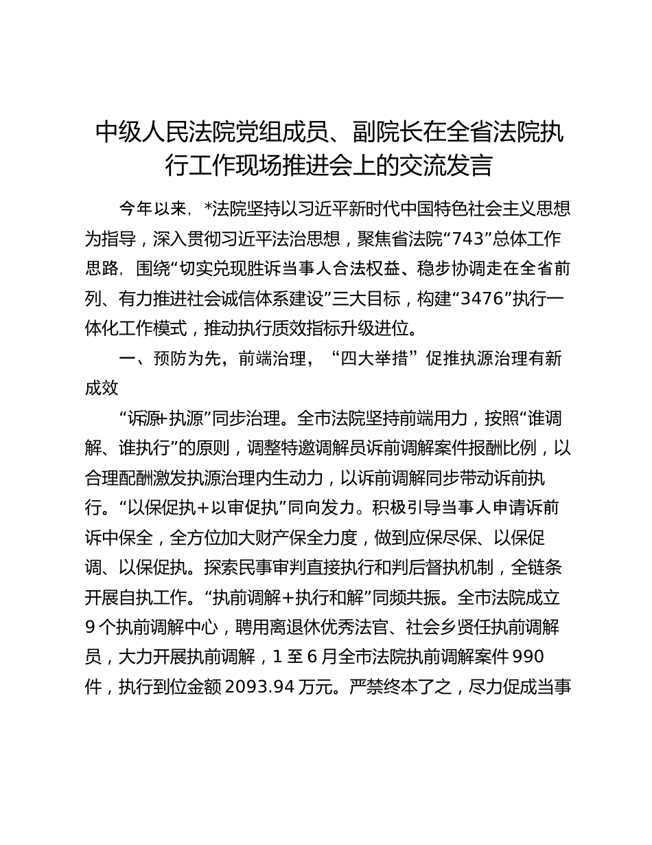 中級(jí)人民法院黨組成員、副院長(zhǎng)在全省法院執(zhí)行工作現(xiàn)場(chǎng)推進(jìn)會(huì)上的交流發(fā)言今年以來(lái),*法院堅(jiān)持以習(xí)近平新時(shí)代中國(guó)特色社會(huì)主義思想“為指導(dǎo),深入貫徹習(xí)近平法治思想,聚焦省法院743”總體工作“思路,切當(dāng)事人合法益、步走在全省前圍繞實(shí)兌現(xiàn)勝訴權(quán)穩(wěn)協(xié)調(diào)”“列、有力推進(jìn)社會(huì)誠(chéng)信體系建設(shè)三大目標(biāo),構(gòu)建3476”執(zhí)行一體化工作模式,推動(dòng)執(zhí)行質(zhì)效指標(biāo)升級(jí)進(jìn)位。一、預(yù)防為先,前端治理,“四大舉措”促推執(zhí)源治理有新成效“訴源+”“執(zhí)源同步治理。全市法院堅(jiān)持前端用力,按照誰(shuí)調(diào)”解、誰(shuí)執(zhí)行的原則,調(diào)整特邀調(diào)解員訴前調(diào)解案件報(bào)酬比例,以合理配酬激發(fā)執(zhí)源治理內(nèi)生動(dòng)...