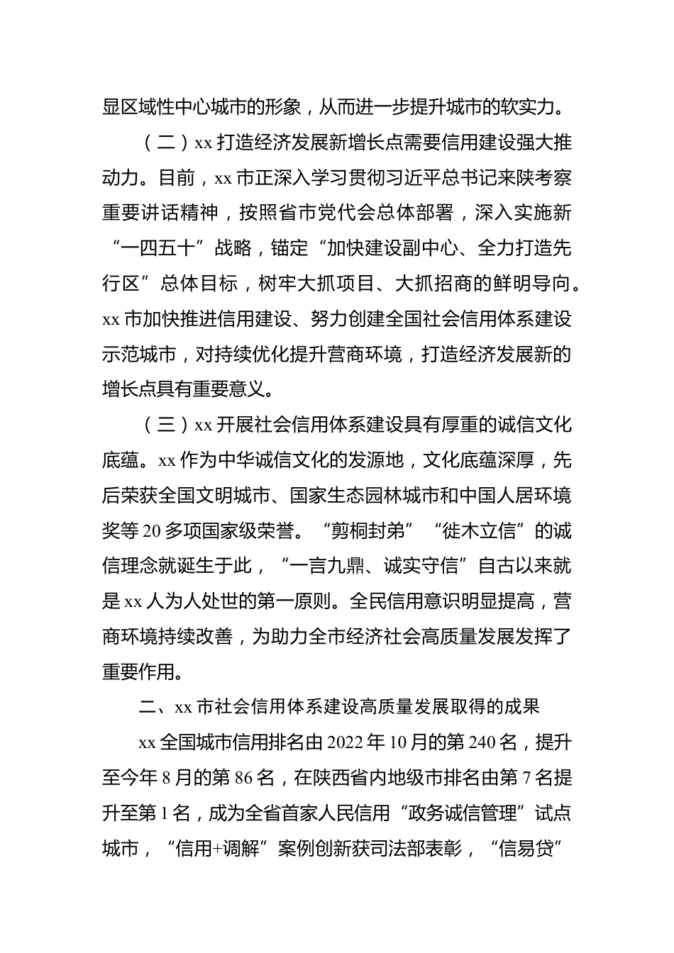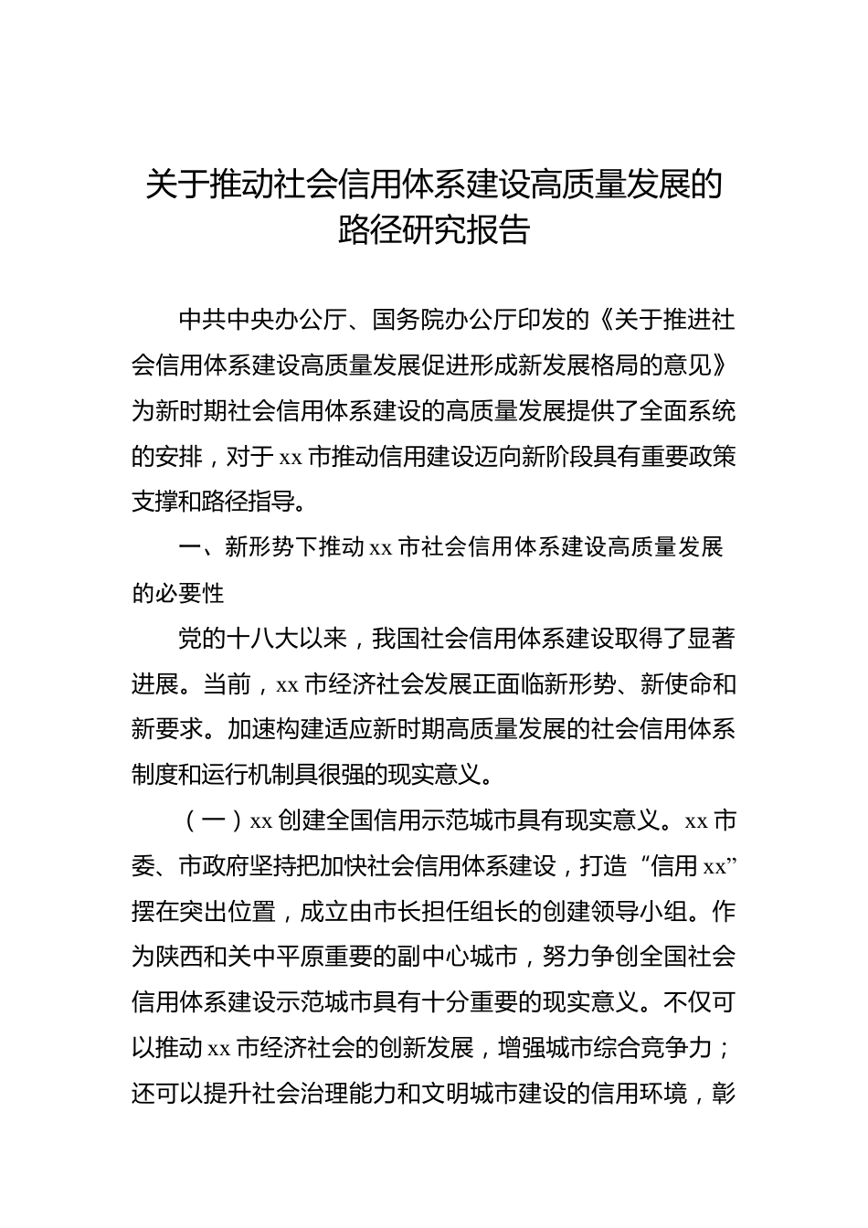 關于推動社會信用體系建設高質(zhì)量發(fā)展的路徑研究報告中共中央辦公廳、國務院辦公廳印發(fā)的《關于推進社會信用體系建設高質(zhì)量發(fā)展促進形成新發(fā)展格局的意見》為新時期社會信用體系建設的高質(zhì)量發(fā)展提供了全面系統(tǒng)的安排,對于xx市推動信用建設邁向新階段具有重要政策支撐和路徑指導。一、新形勢下推動xx市社會信用體系建設高質(zhì)量發(fā)展的必要性黨的十八大以來,我國社會信用體系建設取得了顯著進展。當前,xx市經(jīng)濟社會發(fā)展正面臨新形勢、新使命和新要求。加速構建適應新時期高質(zhì)量發(fā)展的社會信用體系制度和運行機制具很強的現(xiàn)實意義。(一)xx創(chuàng)建全國信用示范城市具有現(xiàn)實意...